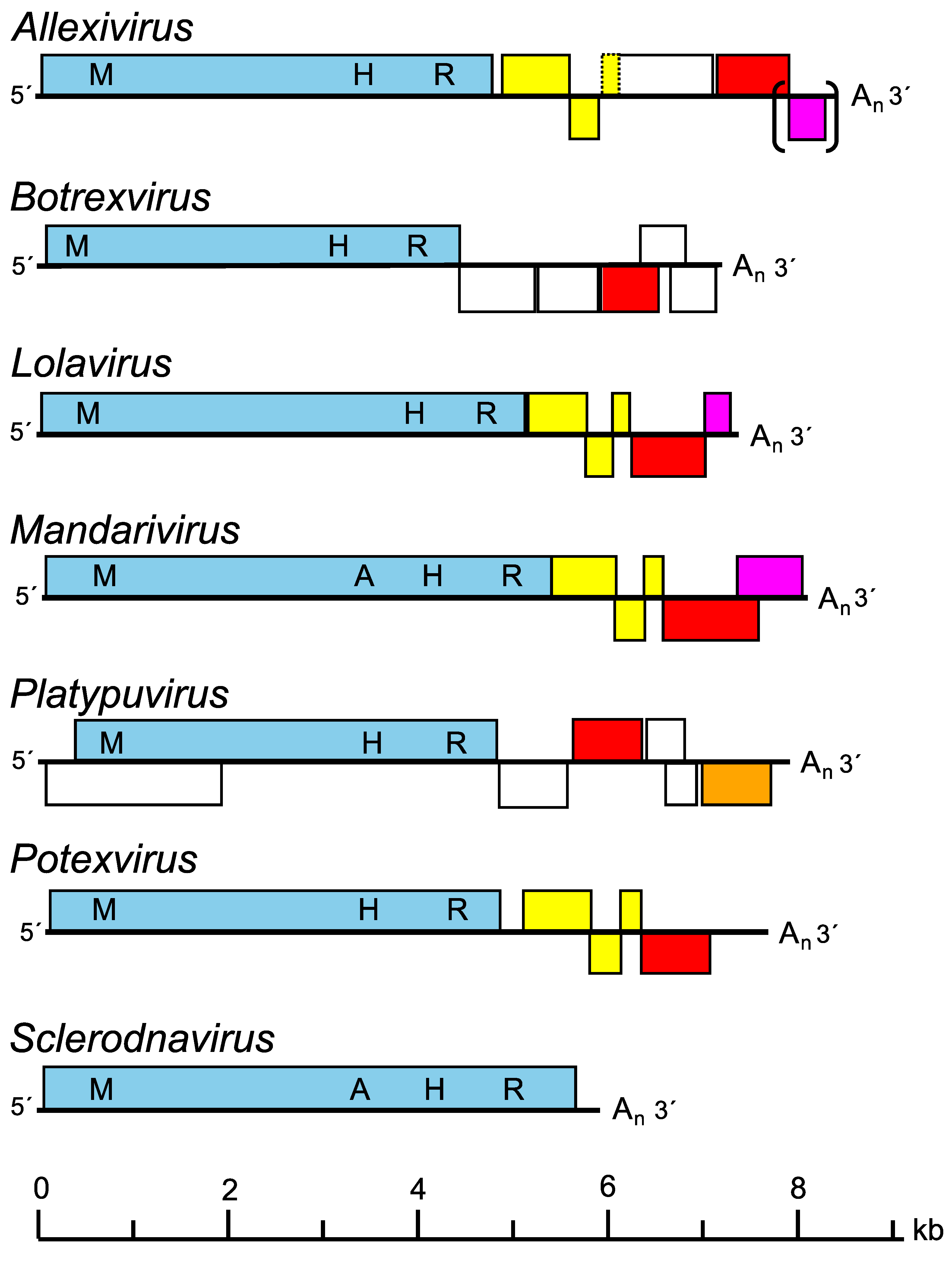 Figure 2. .Alphaflexiviridae. Diagram showing genome organization of members of genera in the family Alphaflexiviridae. Blocks represent predicted open reading frames (ORFs). Rep proteins are shown in blue, triple gene block (TGB) proteins in yellow, 3A-like movement protein in orange, capsid proteins in red and RNA binding proteins in purple. Other ORFs are white. The methyltransferase (M), AlkB (A), helicase (H) and RNA-directed RNA polymerase (R) domains of the replicase are also shown. Brackets indicate ORFs may be missing from some members of a genus and the dashed outline of an ORF indicates that the start codon is missing in virus isolates of several species of the genus.