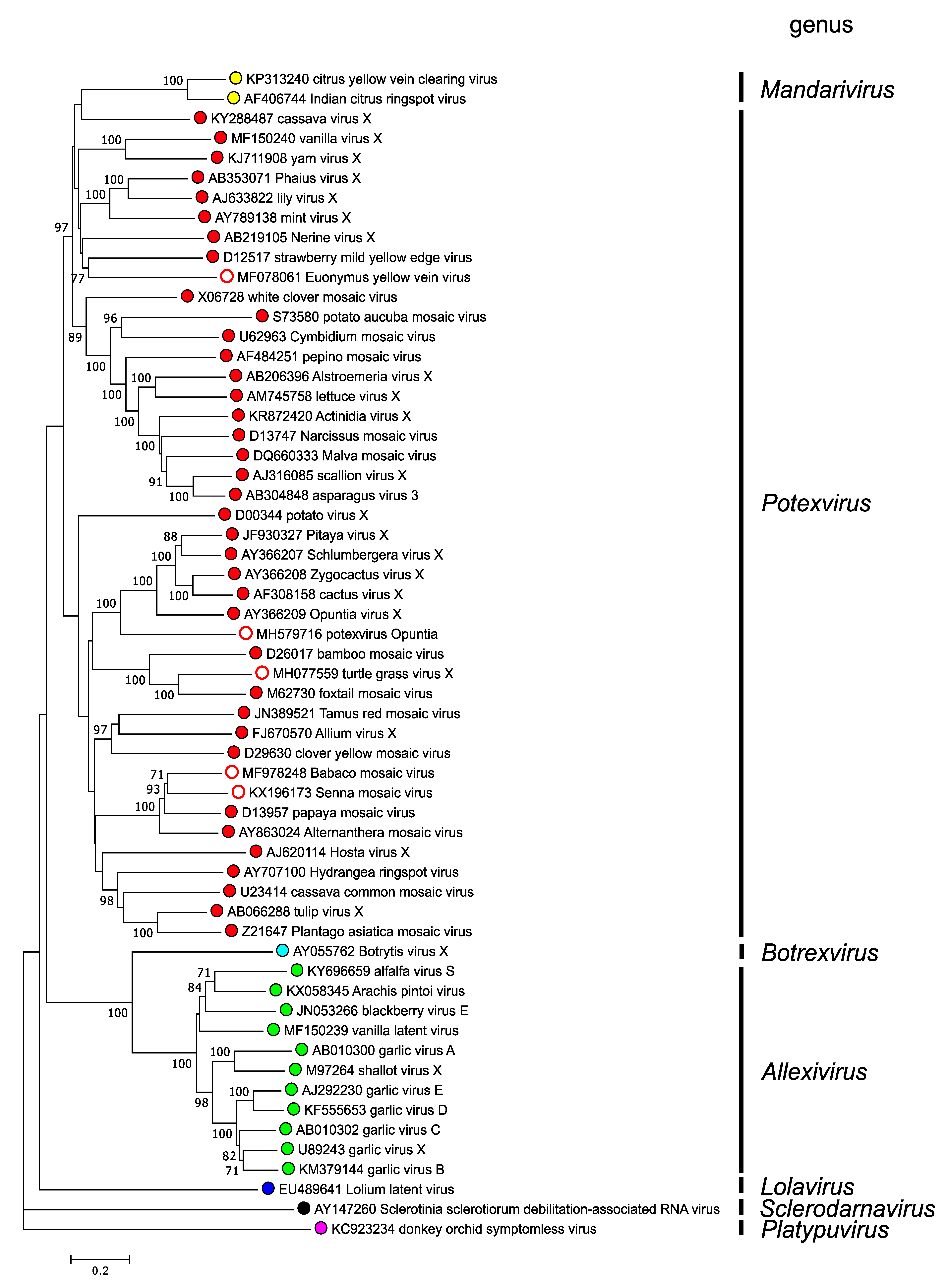 Figure 3. .Alphaflexiviridae Unrooted phylogenetic (distance) tree based on the amino acid sequences of the entire Rep protein of members of the family Alphaflexiviridae. Virus genera are indicated to the right of their respective branches. Numbers on branches indicate percentage of bootstrap support out of 1000 bootstrap replications (when >60%). The scale indicates JTT amino acid distances. Tree produced in (Tamura et al., 2007). This phylogenetic tree and corresponding sequence alignment are available to download from the Resources page