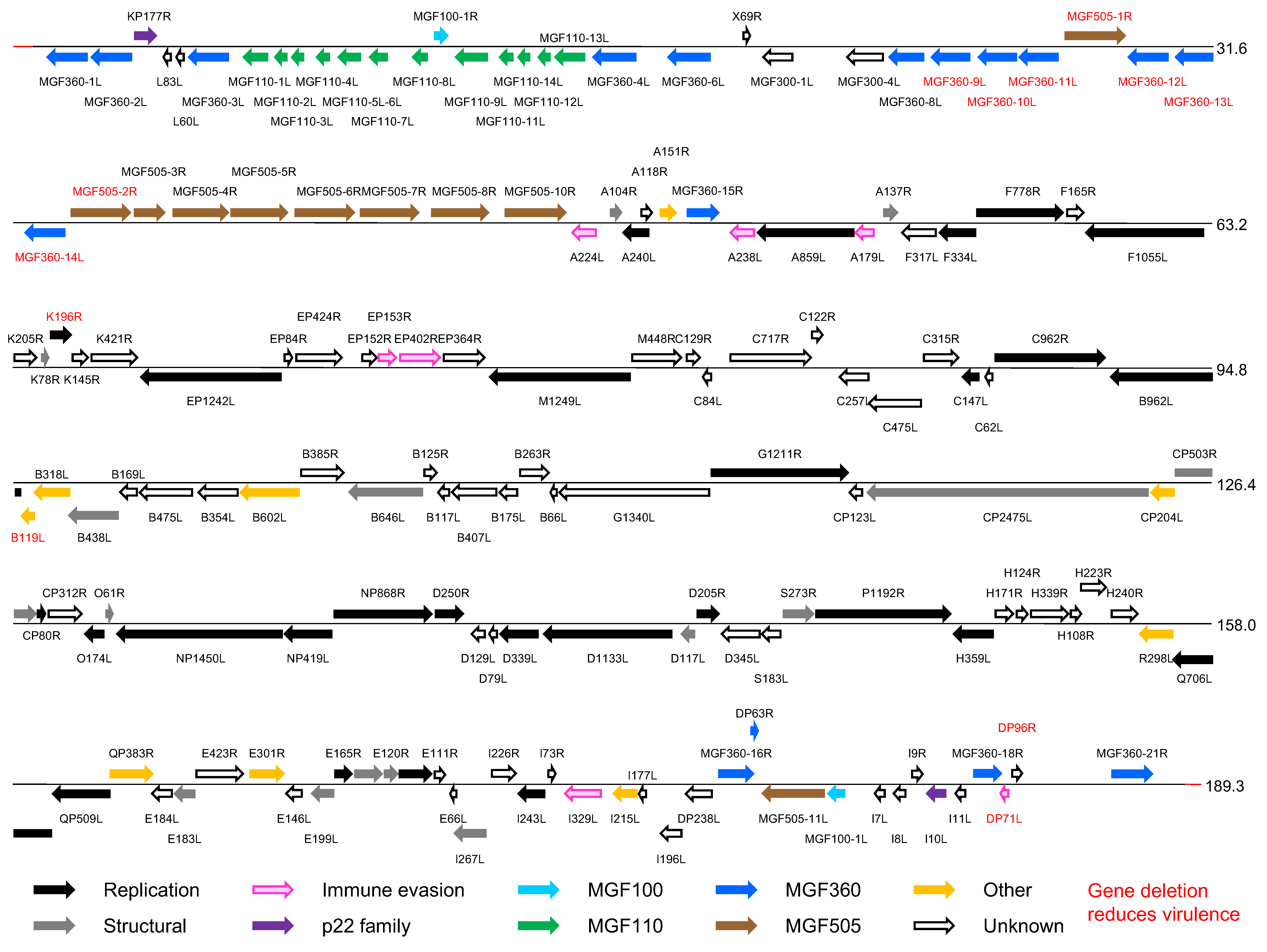 | Multigene family 360 | MGF 360-1L (KP360L) | 41.7 |
