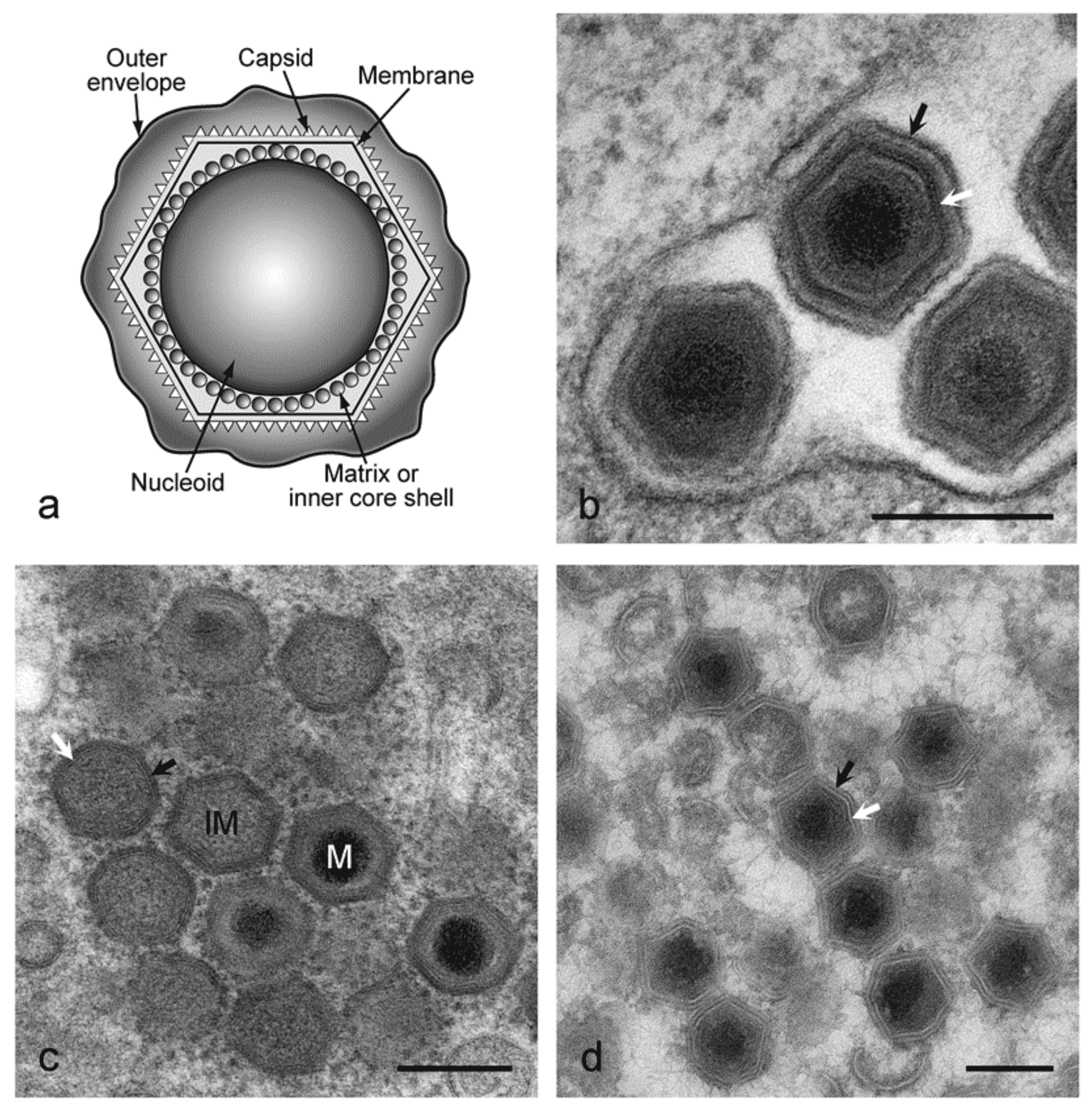 | Virion | Multiple layers of core, internal envelope, capsid and external envelope. Polyprotein processing by a viral protease yields multiple subunit structural proteins |
