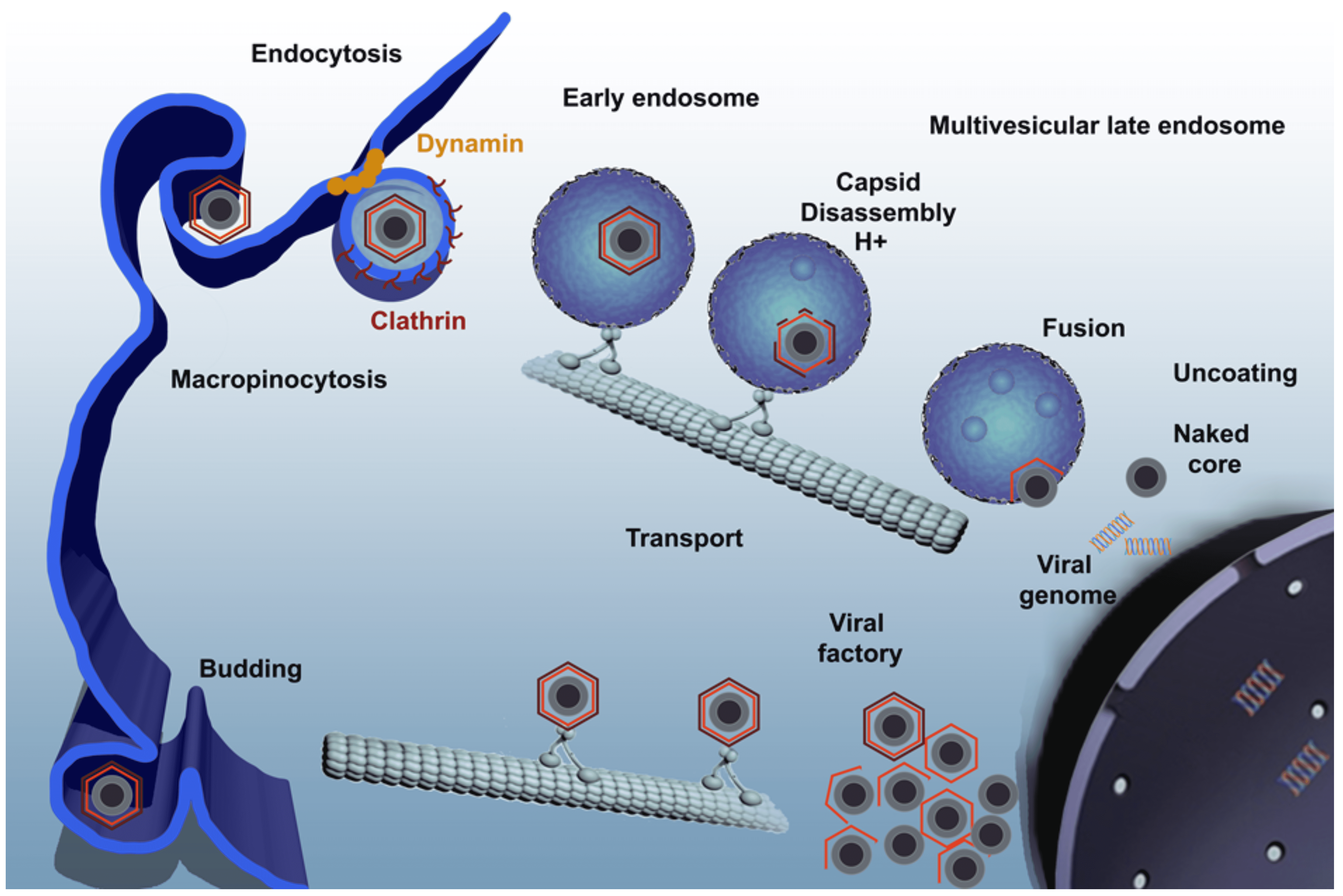 | Figure 3 Asfarviridae. African swine fever virus infectious cycle. Virus enters the cell by a complex process involving clathrin-mediated endocytosis and macropinocytosis. Virions progress rapidly through the endocytic pathway, undergoing uncoating. They reach mature endosomal compartments, where viral decapsidation and then fusion of the internal membrane with the endosomal membrane occur. This liberates viral cores to start replication. Replication and assembly takes place in a cytoplasmic site at the microtubule-organizing centre, giving rise to a structure known as a viral factory. Newly synthesized virions are assembled in the viral factory and exit the cell by budding. (Reprinted with permission from (Galindo and Alonso 2017)). |