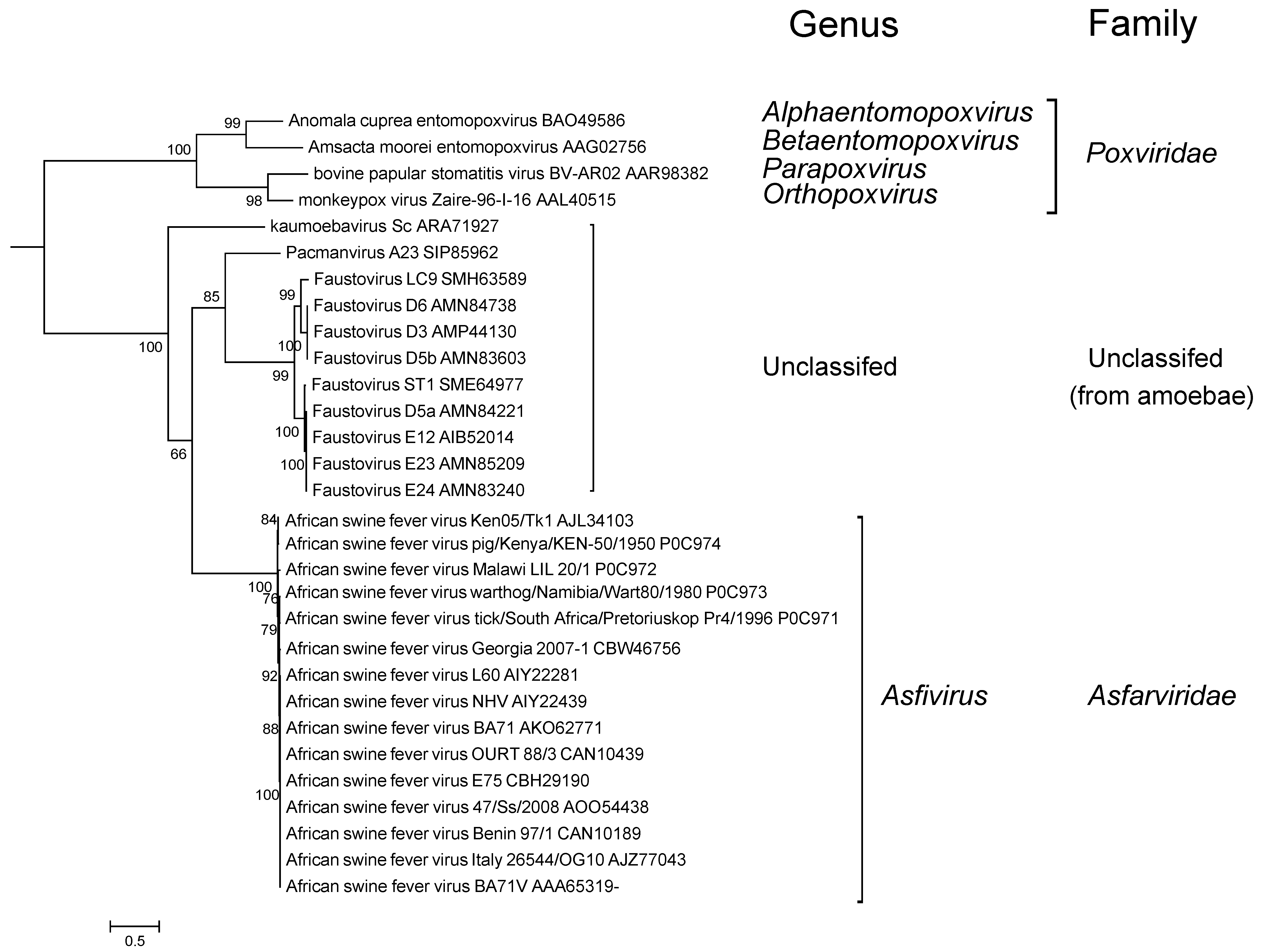 Faustovirus (CZDJ02000001) has a double-stranded DNA genome of 466,000 bp with 451 predicted ORFs sharing distant similarity with ASFV (Klose et al., 2016). A 17,000 bp region includes five putative ORFs that are related to parts of the ASFV major capsid protein. However, the architecture of the related gene of the prototypic Faustovirus E12 (Reteno et al., 2015) is clearly different from that of ASFV as it contains putative introns and exons. In contrast, capsid-encoding genes with introns and exons can be found in other viruses of amoeba such as a mimivirus infecting Acanthamoeba polyphaga. Faustovirus virions have an icosahedral shape and a unique double layered protein capsid. The presence of an inner and outer capsid (with double jelly-roll folds) with spikes and the absence of an internal membrane are other distinct features of the Faustovirus virion. Faustovirus infects amoeba (Vermamoeba vermiformis) (Reteno et al., 2015) and was detected in biting midges (Culicoides imicola) (Temmam et al., 2015).
