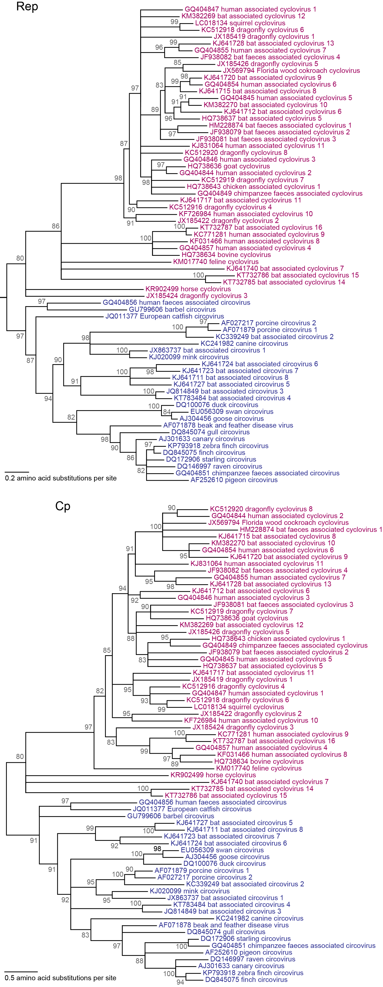 Figure 1. Circoviridae Maximum likelihood (ML) phylogenetic trees of representative replication-associated protein (Rep; top) rooted with Reps of closely related sequences (GenBank accession numbers JX904473, KRC248418 and KJ547623; rooting sequences not shown) and mid-point rooted capsid protein (Cp; bottom) amino acid sequences of representatives from species within the Circovirus (blue font) and Cyclovirus (purple font) genera.  The ML trees were inferred using PhyML (Guindon et al., 2010) with the LG model of substitution after aligning amino acid sequences using the MUSCLE algorithm (Edgar 2004). Branches with <80% SH-like support have been collapsed. Tips are labelled with nucleotide sequence GenBank Accession number and virus name. Figure modified with permission of the authors and reprinted with permission of Springer from Archives of Virology, “Revisiting the taxonomy of the family Circoviridae: establishment of the genus Cyclovirus and removal of the genus Gyrovirus”, doi: 10.1007/s00705-017-3247, Rosario, K., Breitbart, M., Harrach, B., Segales, J., Dewart, E., Biagini, P., Varsani, A. © Springer-Verlag Wien 2017 (Rosario et al., 2017). This phylogenetic tree and corresponding sequence alignment are available to download from the Resources page