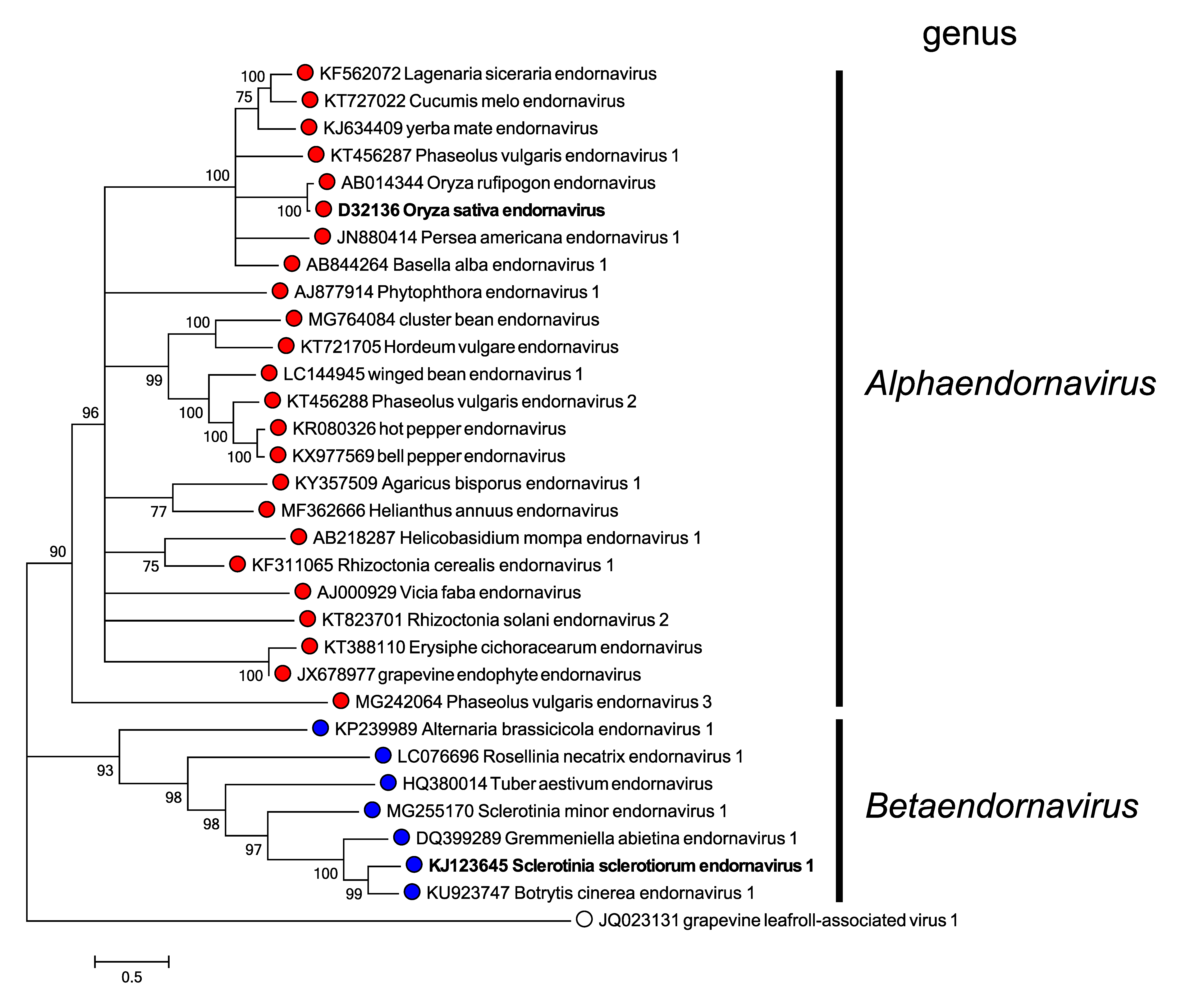 | Figure 2. Endornaviridae. Maximum likelihood phylogenetic tree constructed using the amino acid sequences of RNA-directed RNA polymerase domains of endornaviruses. Grapevine leafroll-associated virus 1 (genus Ampelovirus, family Closteroviridae) was used as an outgroup. For each genus, a virus belonging to the type species is indicated by bold text. This phylogenetic tree and corresponding sequence alignment are available to download from the Resources page. |