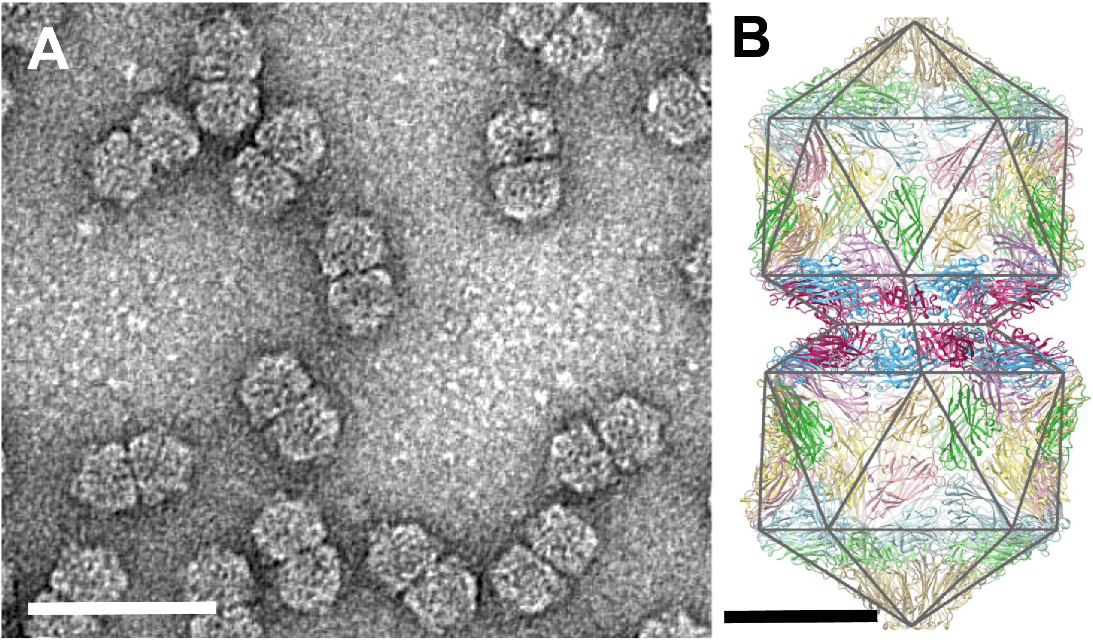 | Figure 1. Geminiviridae. (A) Purified particles of maize streak virus (MSV) stained with uranyl acetate showing typical twinned quasi-isometric subunits. The bar represents 50 nm. Reproduced with permission from (Zhang et al., 2001). (B) Complete atomic model for all 110 subunits in the capsid of Ageratum yellow vein virus (AYVV), with a polyhedral cage showing the symmetry of the particle. The fivefold symmetry axis is vertical and through the center of the particle in this view. Bar, 10 nm. CC BY 4.0 licence from (Hesketh et al., 2018). |