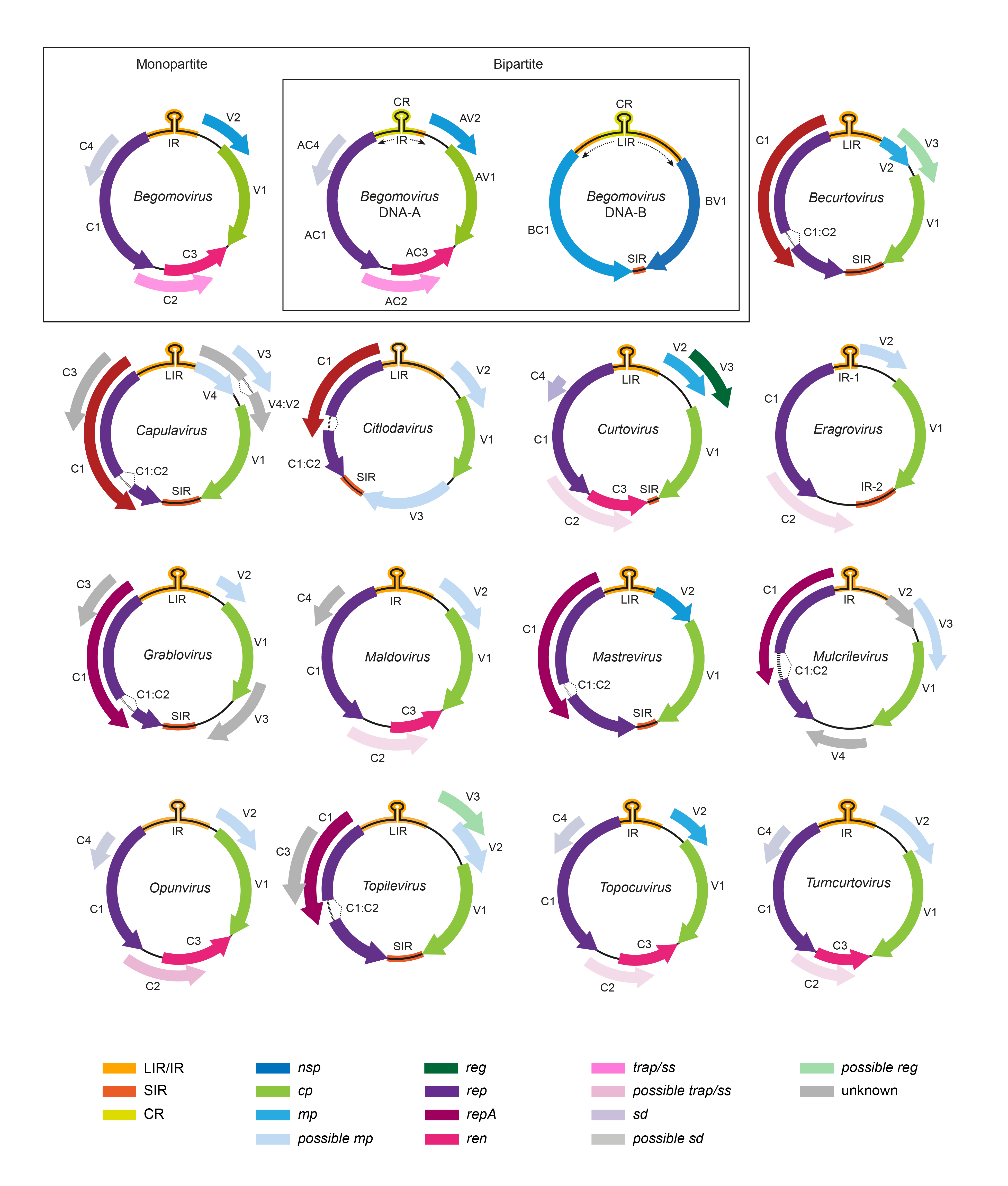 | Figure 2. Geminiviridae. Genomic organization of members of the family Geminiviridae. ORFs are denoted as being encoded on the virion-sense (V) or complementary-sense (C) strand, and corresponding protein products are coded by colour. The position of the stem-loop containing the conserved 5′-TAATATTAC-3′ sequence located in the intergenic region (IR/IR-1) and long intergenic region (LIR) is shown. For begomoviruses, V2/AV2 is not present in New World viruses. CP, coat protein; IR, intergenic region; LIR, long intergenic region; SIR, short intergenic region; MP, movement protein; NSP, nuclear shuttle protein; REn, replication enhancer protein; Rep, replication-associated protein; SIR, short intergenic region; TrAP, transcriptional activator protein. |