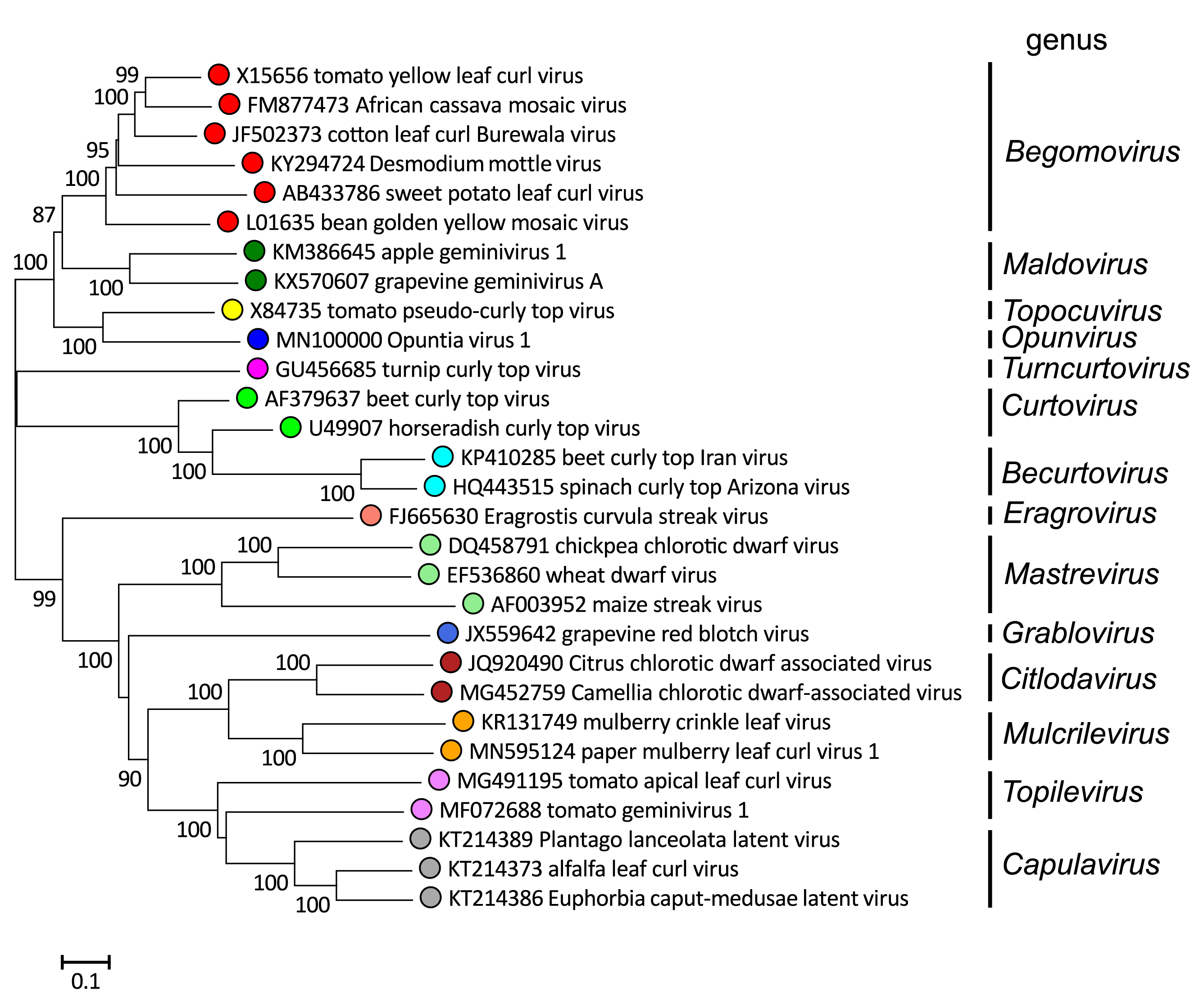 Viruses in the genera Becurtovirus, Capulavirus, Citlodavirus, Curtovirus, Eragrovirus, Grablovirus, Maldovirus, Mastrevirus, Mulcrilevirus, Opunvirus, Topilevirus, Topocuvirus and Turncurtovirus have a single genomic component, whereas those in the genus Begomovirus have either one or two components (Figure 2. Geminiviridae).