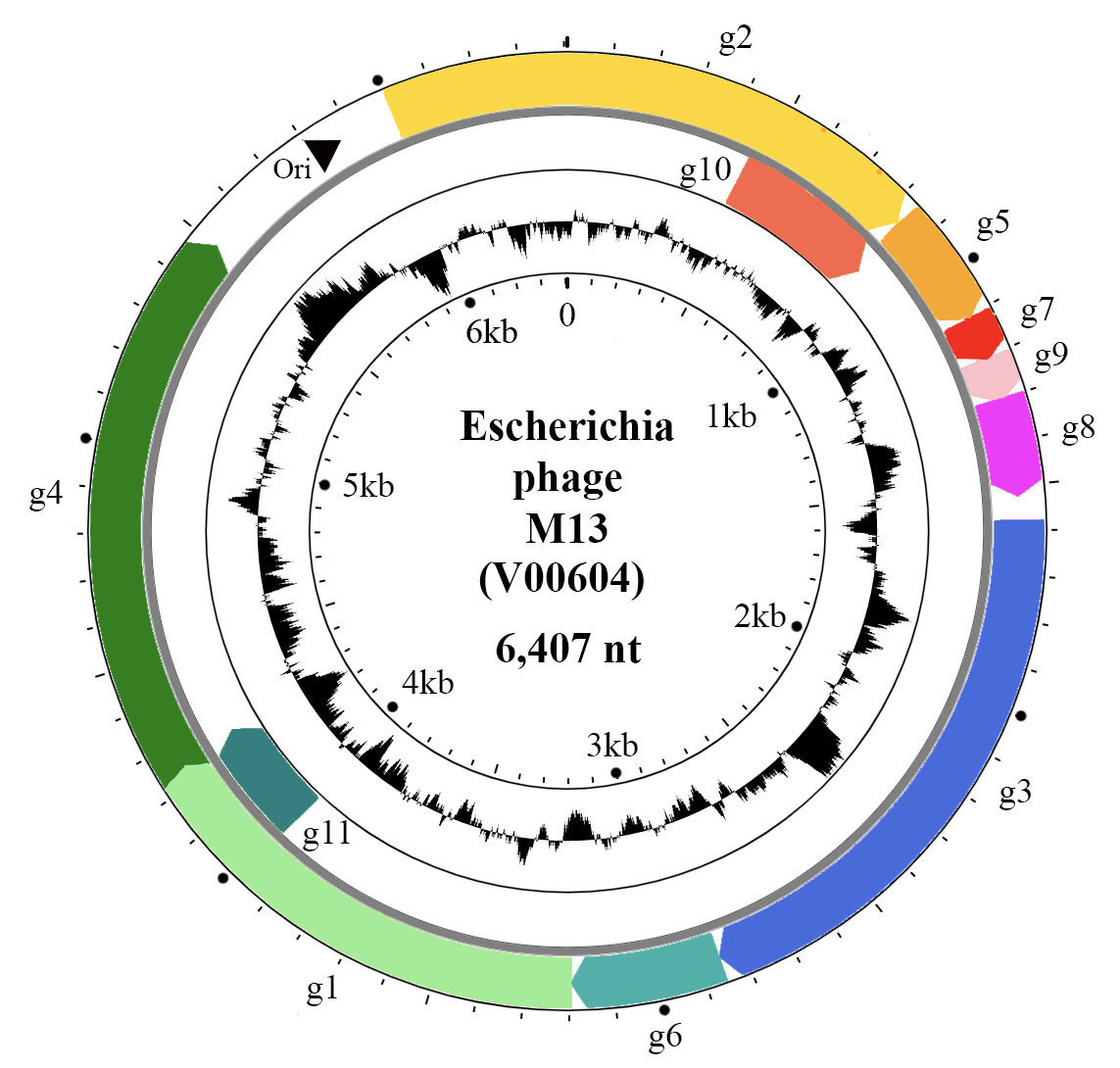 | Figure 2. Inoviridae. Circular representation of the Escherichia phage M13 genome. Genes (coloured arrows) are organised in modules of replication genes (g2, g5 and g10), structural genes (g7, g9, g8, g3, g6) and morphogenesis genes (g1, g4 and g11). Inner circle indicates GC content. |