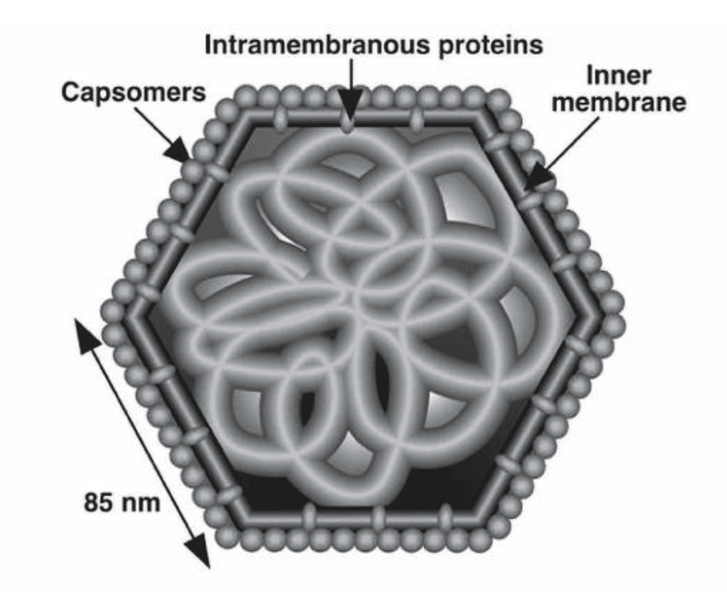 Figure 1. Iridoviridae.  Schematic diagram of a cross-section of an iridovirus particle, showing capsomers, the internal lipid bilayer containing transmembrane proteins and the filamentous nucleoprotein core (from (Darcy-Tripier et al., 1984) with permission).