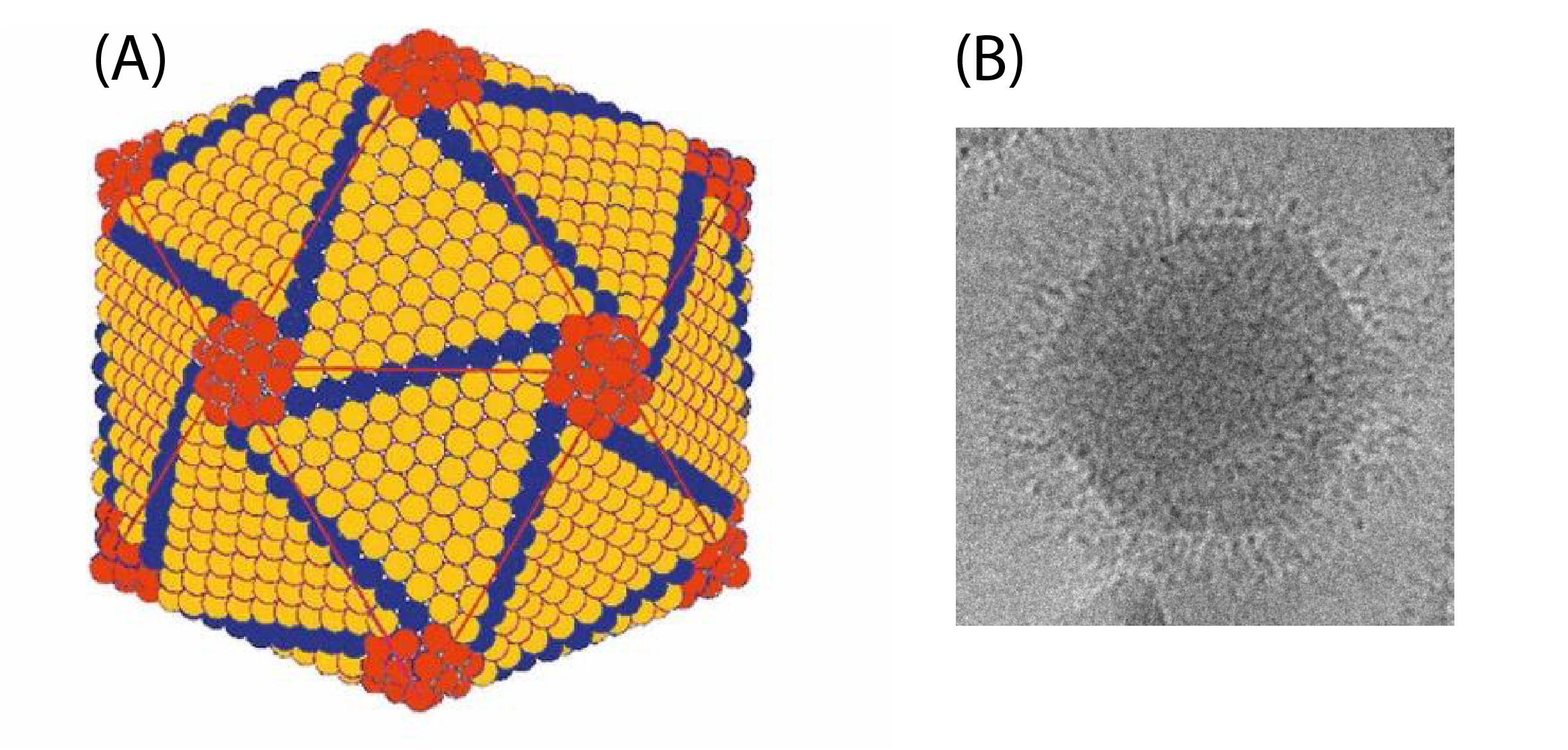 Figure 2. Iridoviridae.  A: Outer shell of invertebrate iridescent virus 2 (IIV2). Shown are trisymmetrons (orange) comprising the 20 icosahedral faces and pentrasymmetrons (red) located at the 12 vertices, and disymmetrons (blue) located at the edges of the icosahedral faces (Adapted from (Wrigley 1969) with permission). B: Cryo-transmission electron micrograph of IIV6 displaying a fringe of hair-like fibers surrounding the viral particle (figure provided by IA Ince and J van Lent).