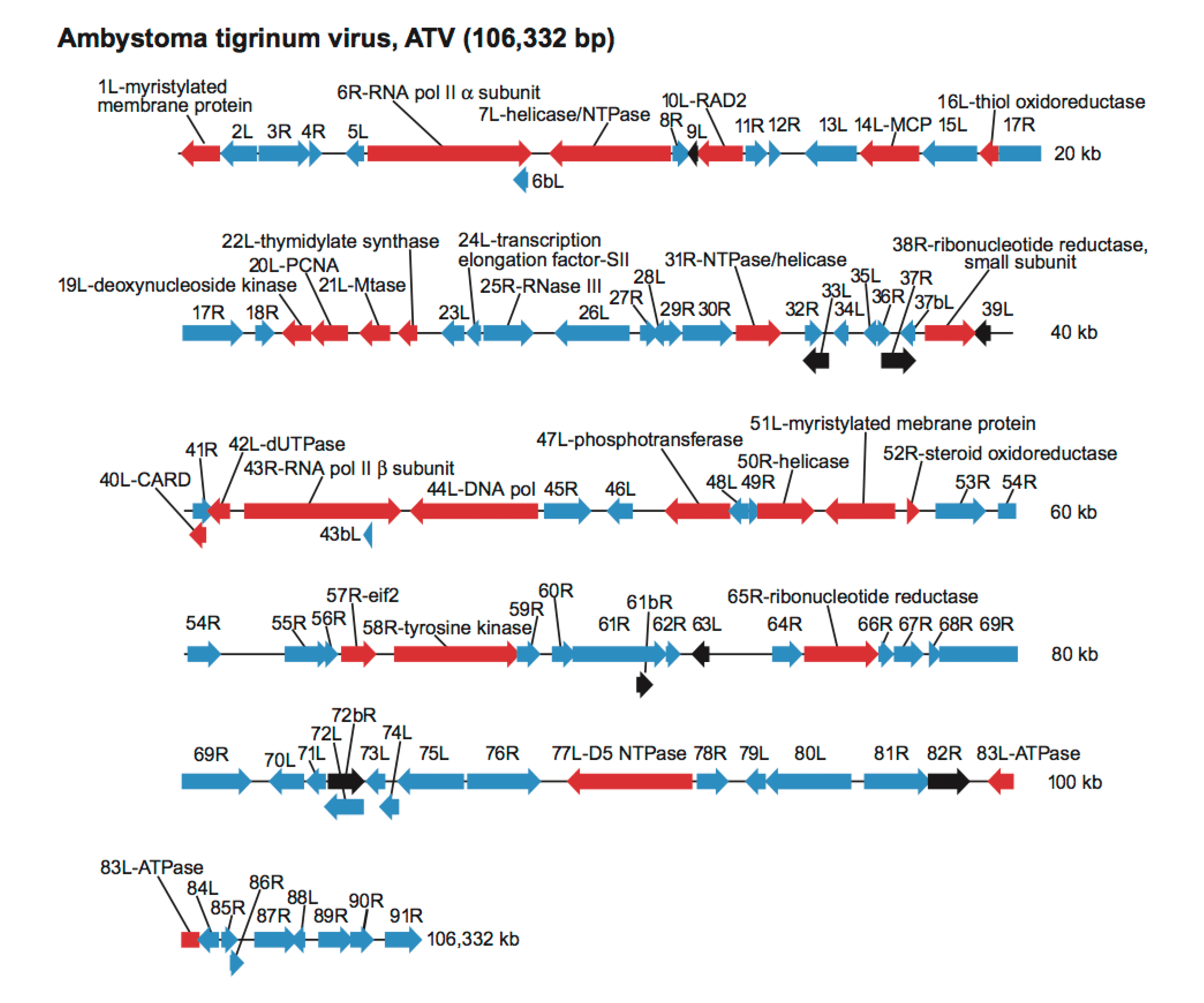 Figure 3. .Iridoviridae.  Genetic organization of a representative member of the family Iridoviridae, Ambystoma tigrinum virus (ATV), species Ambystoma tigrinum virus, genus Ranavirus. Arrows represent viral ORFs with their size, position and orientation shown. ORFs of known function are colored red and their putative proteins identified; ORFs with known homology to tiger frog virus (TFV), an isolate of Frog virus 3, but of unknown function are shaded blue; and those of unknown function or with no homology to TFV are indicated in black.