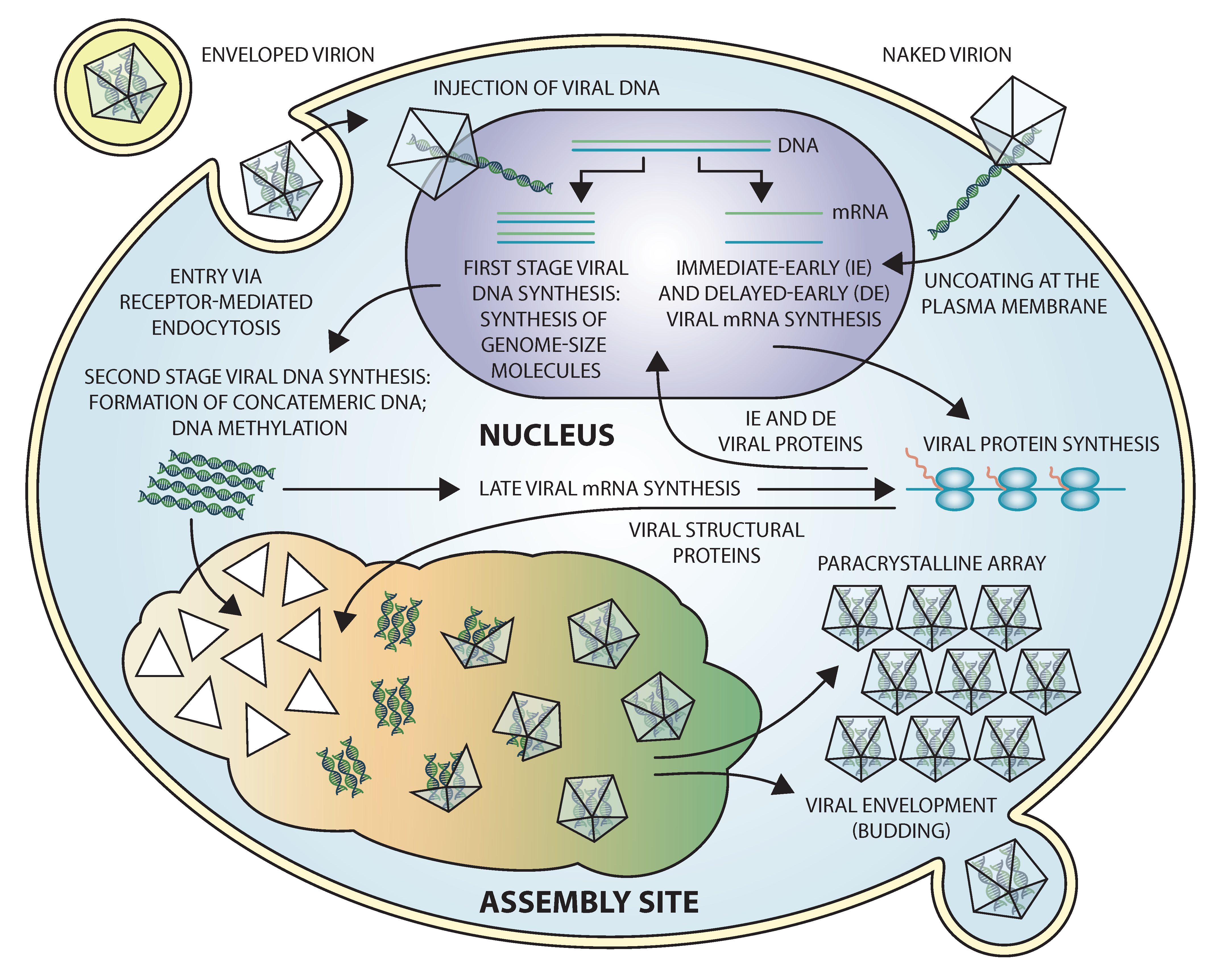 Figure 4. .Iridoviridae.  Replication strategy of frog virus 3 (FV3). Replication begins in the nucleus with the synthesis of early viral transcripts and the synthesis of unit size, to twice unit size, DNA genomes that are subsequently transported to the cytoplasm where a second round of DNA replication results in the formation of large concatemers. Late messages are synthesized in the cytoplasm using a multi-subunit, virus-encoded transcriptase. Virion formation takes place in morphologically distinct assembly sites and viral particles are seen within assembly sites, paracrystalline arrays, and budding from the plasma membrane.