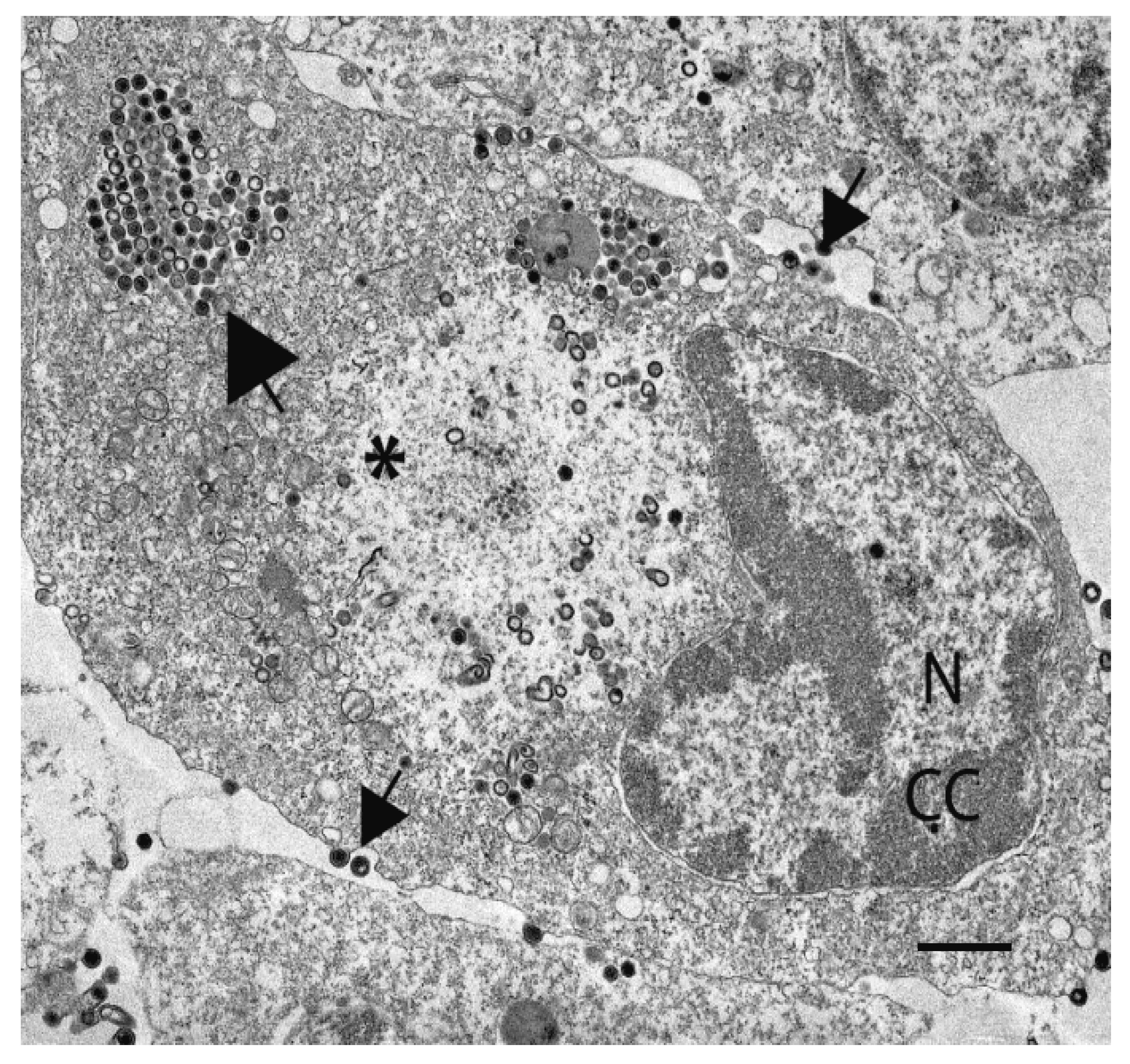 Figure 5. Iridoviridae.  Transmission electron micrograph of a fathead minnow cell infected with FV3. Nucleus, N, showing signs of chromatin condensation (CC); a large electron-lucent assembly site (*) containing numerous immature, empty virions, few mature virions, and devoid of cellular organelles; a paracrystalline array of virus particles (large arrow); budding virions (small arrow); scale bar = 1 µm (figure provided by VG Chinchar and RC Sample).