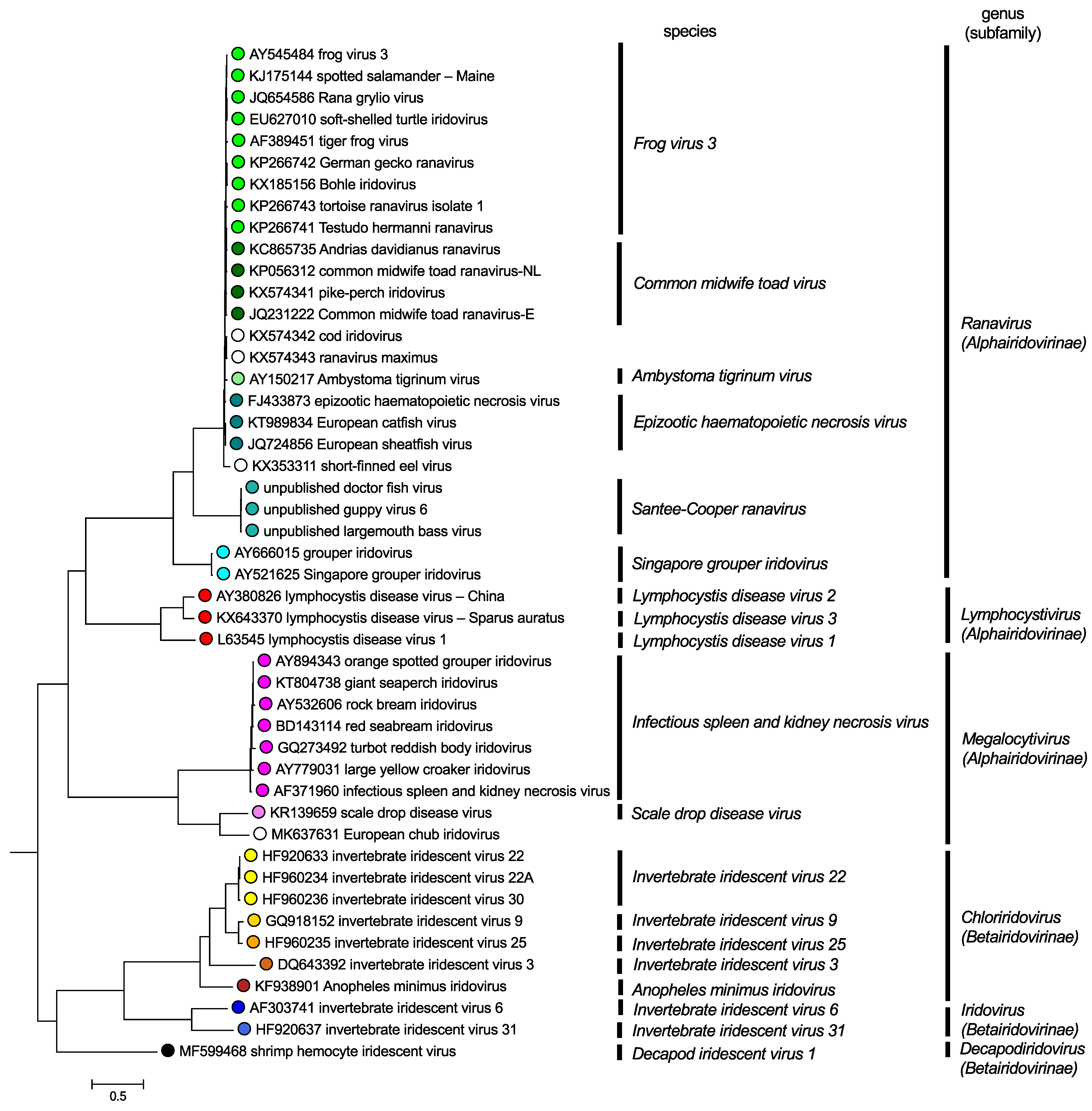 Phylogenetic analyses (Figure 6. Iridoviridae), based on individual genes, or a concatenated set of 26 genes common to all members of the family, support the division of the family into two subfamilies and six genera (Chinchar et al., 2011, Jancovich et al., 2015). Viruses within a genus generally share greater than 50% identity at the nucleotide and amino acid levels. Moreover, viruses displaying greater than 95% sequence identity are considered to be isolates/strains of the same viral species. For example, the ranaviruses FV3, Bohle iridovirus (BIV), tiger frog virus (TFV), and Rana gyrilo virus (RGV) show >95% sequence identity and a similar genomic organization and are viewed as isolates of the same viral species, Frog virus 3. In contrast, FV3, ATV, and EHNV show >90% sequence identity, but differ in host range and genomic organization and thus are classified as members of separate species.  Furthermore, members of the six currently recognized species within the genus Ranavirus fall into four distinct phylogenetic clusters (Figure 6. Iridoviridae), while megalocytiviruses fall into two clusters and lymphocystiviruses fall into three clusters.