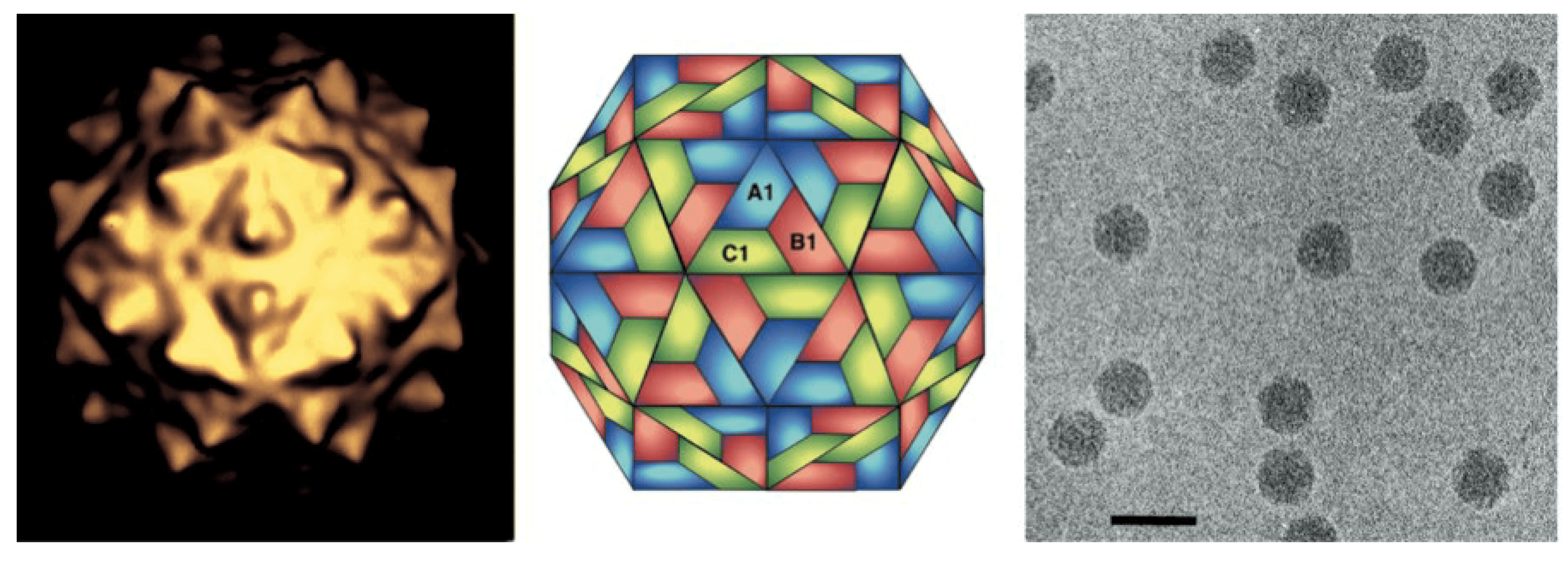 Figure 1. Nodaviridae.  Flock House virus particles. (Left) Image reconstruction, (Center) schematic representation of a T=3 icosahedral lattice, A1, B1 and C1 indicate three different quasi-equivalent copies of the capsid protein, (Right) cryo-electron micrograph; the bar represents 50 nm. (Courtesy of N. Olson and T. Baker.)