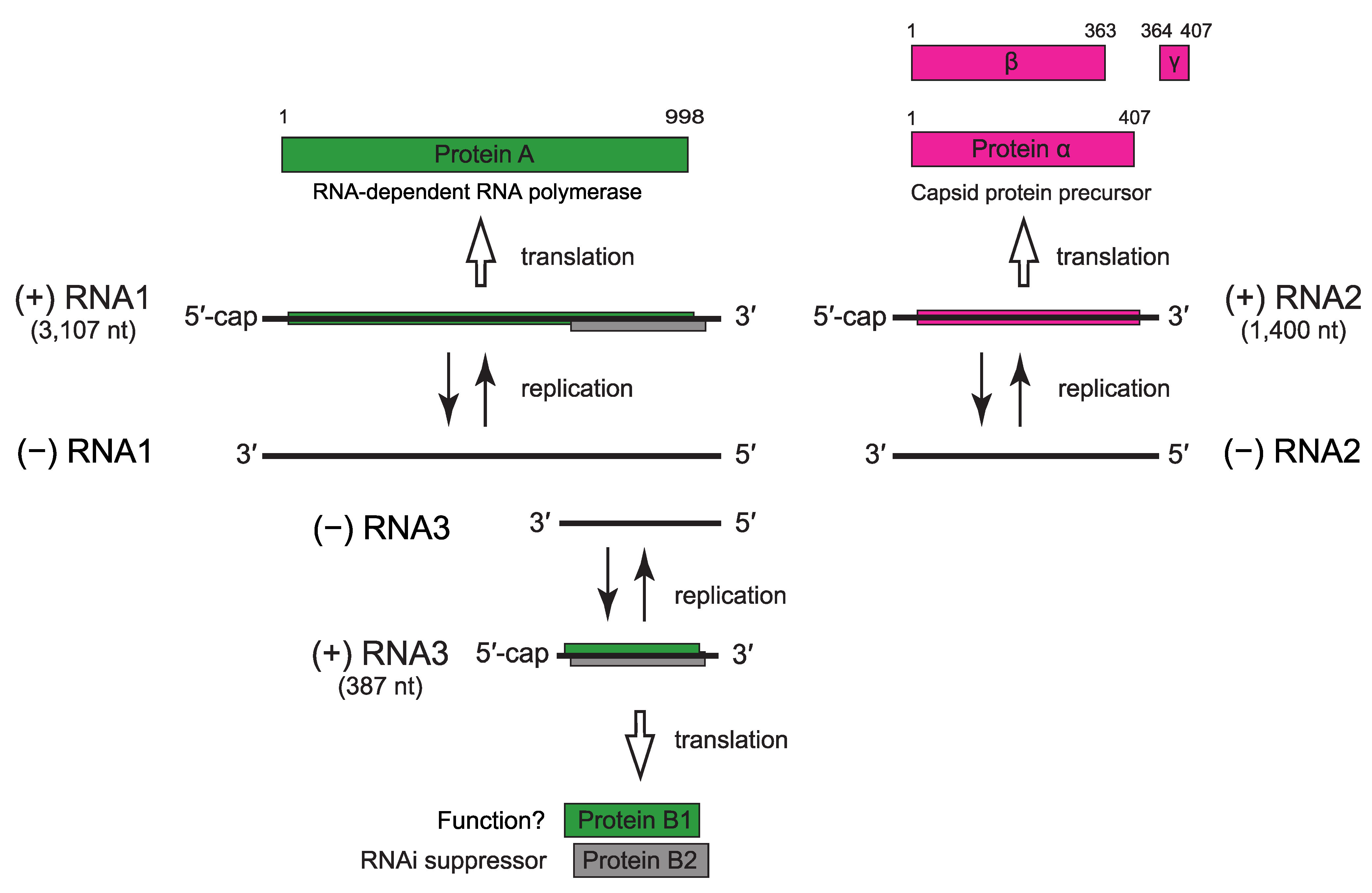 Figure 2. Nodaviridae.  Flock House virus (Alphanodavirus) genome organization and strategy of replication.