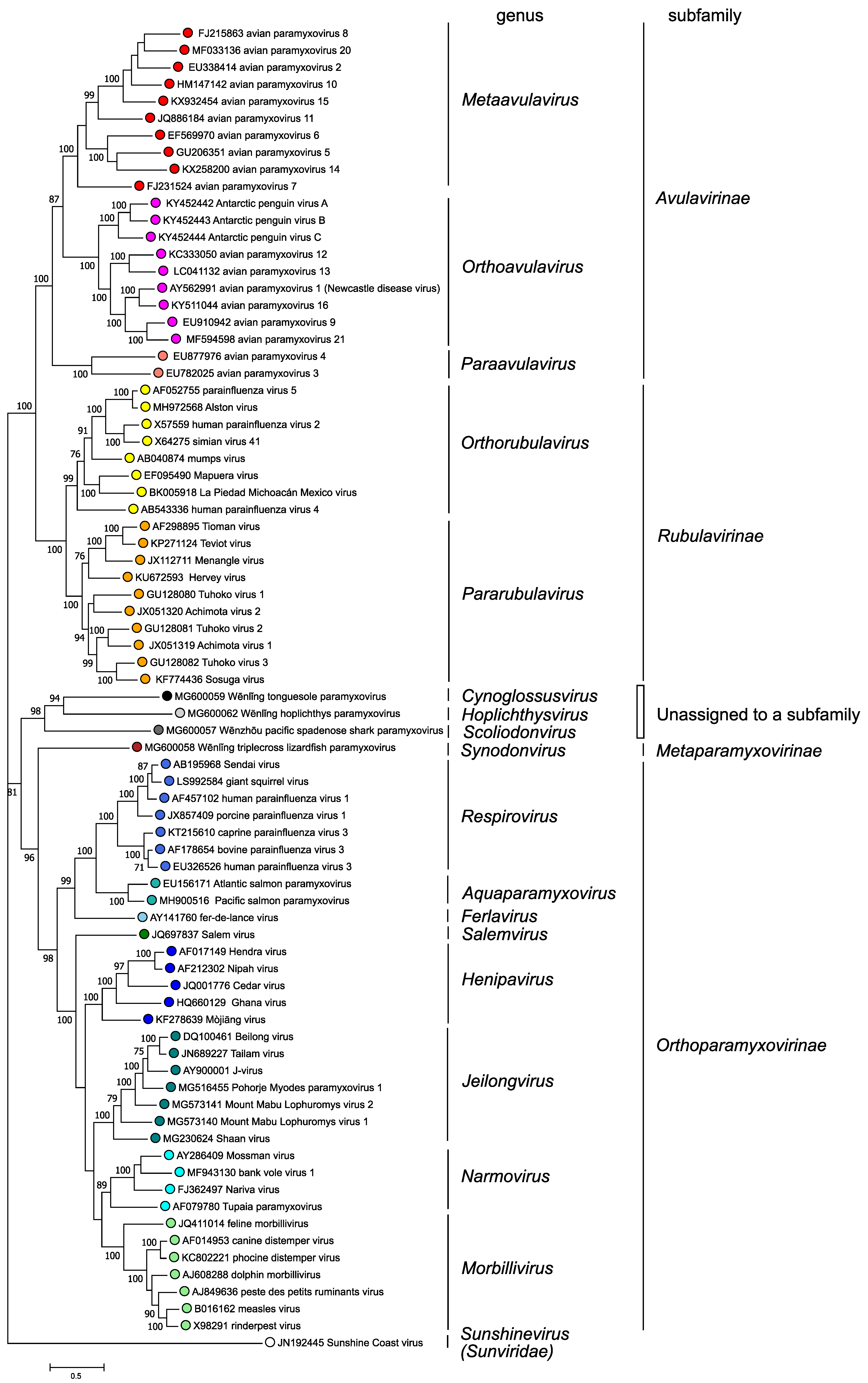 Figure 3. .Paramyxoviridae.  Phylogenetic analysis of complete L protein amino acid sequences of members of the family Paramyxoviridae. Complete L protein amino acid sequences were aligned by Clustal W with gap generation penalties of 5 and extension penalties of 1 in both multi and pairwise alignments. The evolutionary history was inferred by using the Maximum Likelihood method and JTT matrix-based model. The tree with the highest log likelihood (-258124.74)  is shown. The percentage of 500 trees in which the associated taxa clustered together is shown next to the branches where this was > 70%. Initial tree(s) for the heuristic search were obtained automatically by applying Neighbor-Join and BioNJ algorithms to a matrix of pairwise distances estimated using a JTT model, and then selecting the topology with superior log likelihood value. The tree is drawn to scale, with branch lengths measured in the number of substitutions per site. This analysis involved 78 amino acid sequences. There were a total of 2745 positions in the final dataset. Evolutionary analyses were conducted in MEGA X (Kumar et al., 2018). This phylogenetic tree and corresponding sequence alignment are available to download from the Resources page