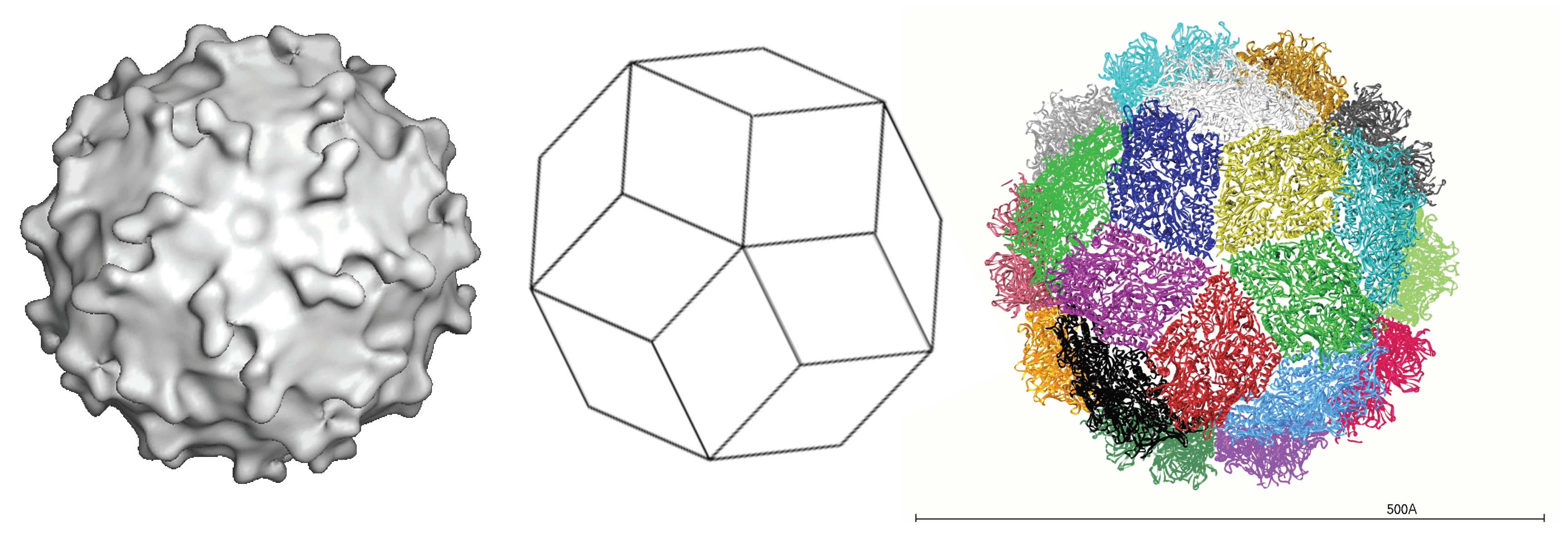 Figure 1. Picobirnaviridae.  Structure of the picobirnavirus particle. (Left) Surface rendering from a three-dimensional reconstruction viewed down a slightly mis-oriented five-fold axis. Note the presence of 60 dimeric protrusions (courtesy of L. Lepault). (Middle) Diagram representing a triacontahedron, a convex polyhedron made of 30 rhombic faces or diamond tiles. (Right) Triacontahedral design of the particle, with each of the tiles formed by two capsid protein dimers colored differently (courtesy of S. Duquerroy).