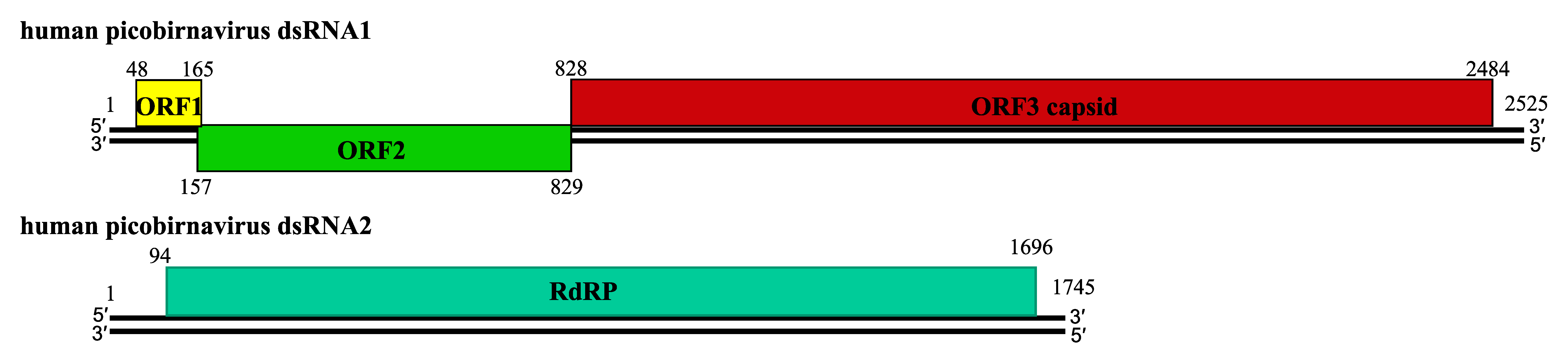 Virions contain two unrelated, linear dsRNA segments (dsRNA1 and dsRNA2) (Pereira et al., 1988). The larger segment (dsRNA1) is 2.4–2.7 kbp with two or three ORFs (Green et al., 1999, Rosen et al., 2000, Wakuda et al., 2005). The smaller segment (dsRNA2) is 1.7–1.9 kbp and is monocistronic. It encodes the viral RNA-dependent RNA polymerase (RdRP). Several picobirnavirus genomes belonging to different genetic clusters are unsegmented with dsRNA2 fused to the 3′-end of dsRNA1 (Li et al., 2015, Shi et al., 2016).