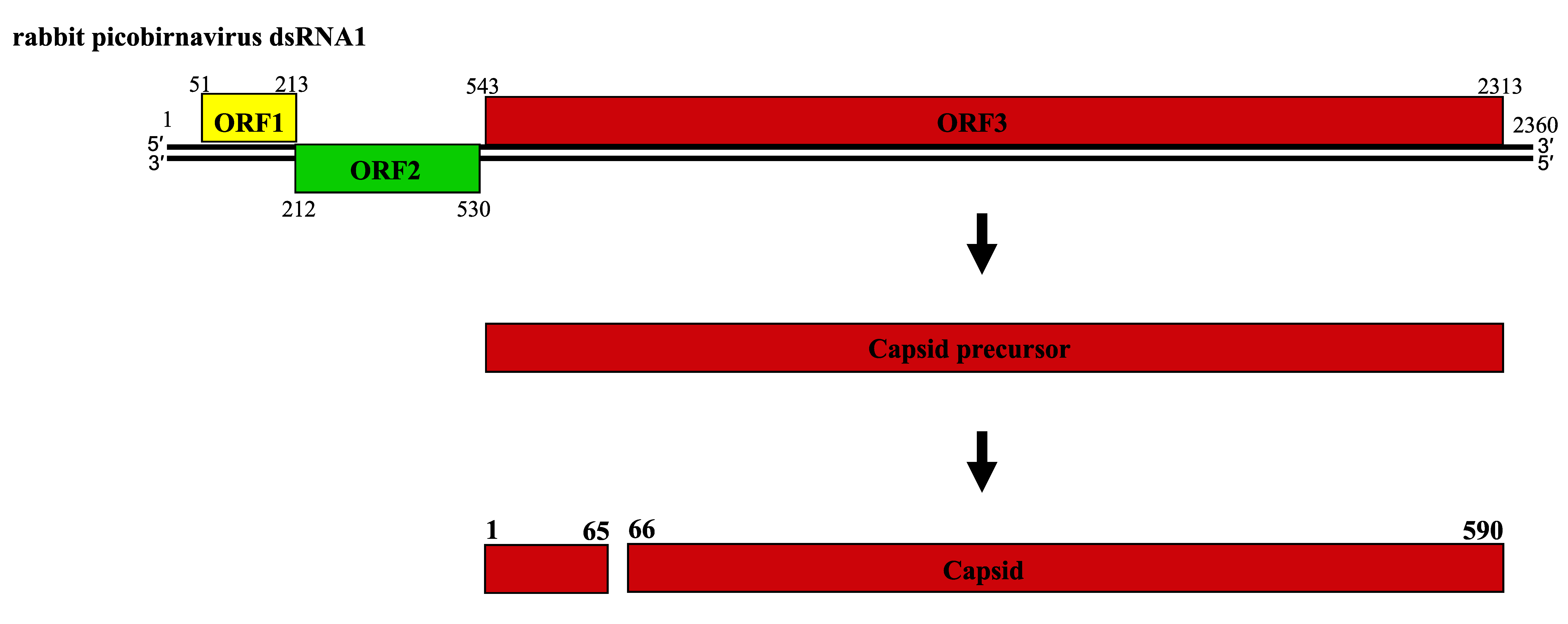 Figure 3. Picobirnaviridae Schematic representation of the gene arrangement in dsRNA1 of rabbit picobirnavirus and processing of the capsid protein precursor. Numbers indicate the nucleotide positions (in normal type) and the amino acid positions (in bold type).