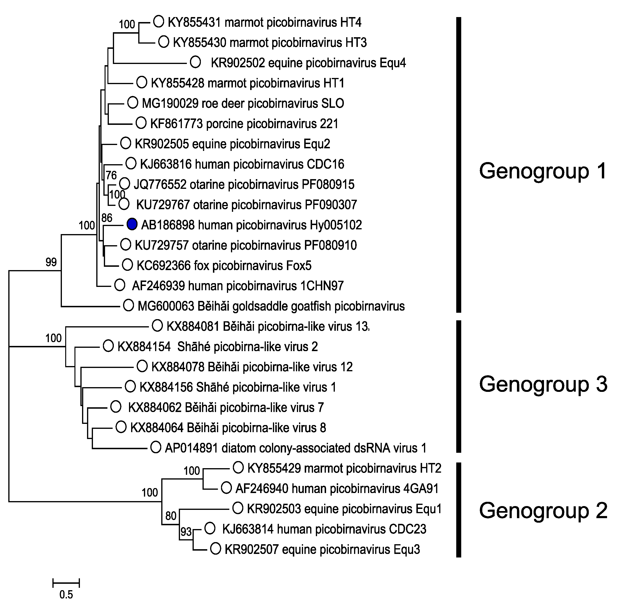Figure 4. Picobirnaviridae A distance tree representing the phylogenetic relationships among RdRPs of picobirnaviruses. The unrooted tree (NJ, complete deletion) was constructed using Mega7 (Kumar et al., 2016).  The tree calculation is therefore based only on positions at which an amino acid is present for all sequences in the multiple alignment (ClustalW in Mega 7). Numbers indicate bootstrap values (n=500) for the tree nodes where these were >70%. Sequences are represented by their protein accession numbers. Three RDRP genogroups are indicated. The exemplar isolate of Human picobirnavirus is indicated with a blue spot. This phylogenetic tree and corresponding sequence alignment are available to download from the Resources page