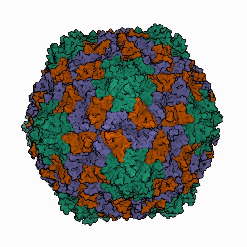 | Figure 1. Solemoviridae. Three-dimensional cryo-electron reconstruction of the particle of rice yellow mottle virus at 2.8 Å resolution. The capsid comprises 180 copies of a single capsid protein arranged in T=3 quasi-equivalent symmetry. The icosahedral asymmetric unit contains three subunits: A (in green), B (in brown), and C (in blue). Image from the RCSB PDB (rcsb.org) of PDB ID 1F2N (Opalka et al., 2000). |