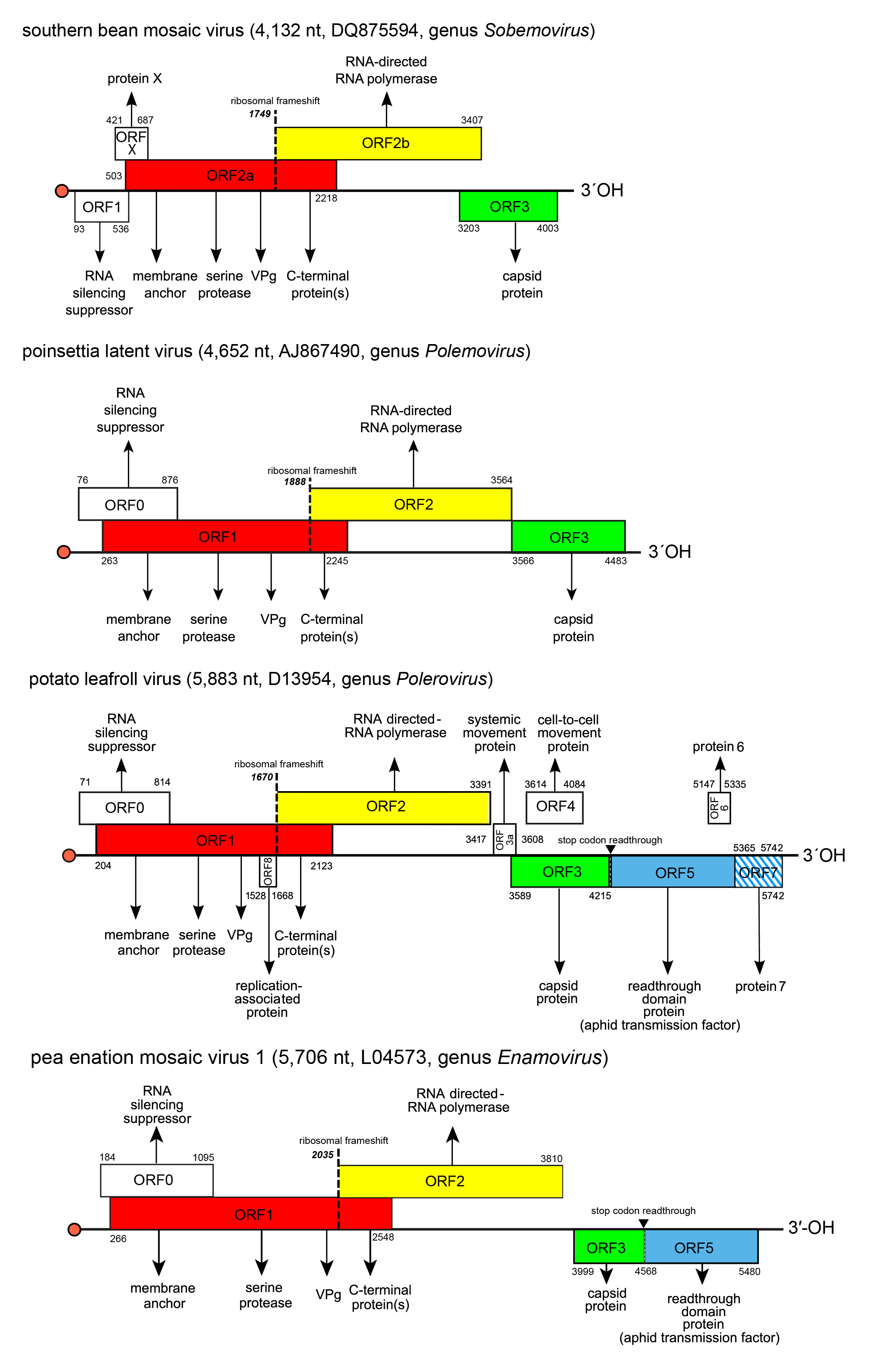 | Figure 2. Solemoviridae. Genome organization of the members of the genera Enamovirus, Polemovirus, Polerovirus and Sobemovirus. Red bullets indicate the virus protein genome-linked (VPg) covalently attached at the 5′-end of the RNAs. ORF reading frames are indicated by their position above and below the genome in the order -1, 0 and +1 and encode the polyprotein composed of the transmembrane domain, VPg, serine protease, and C-terminal protein(s) (red), RdRP (yellow). 3′-proximal ORFs encode the coat protein (CP, green) and readthrough domain protein related to aphid transmission properties (blue). Other ORFs have no sequence homology at the family level. ORF1 of sobemoviruses and ORF0 of enamoviruses, polemoviruses, and poleroviruses encode viral RNA silencing suppressors. Proteins encoded by ORFX of sobemoviruses and ORF3a of poleroviruses are needed for systemic infection. ORF4 of poleroviruses encodes movement protein, ORFs 6 and 7 encode proteins regulating the virus transcription and replication. ORF8 encodes a replication-associated protein that is unique for PLRV. The hatched area indicates an overlap between two ORFs in the same reading frame. The switch to ORF2 (or ORF2b in sobemoviruses) is determined by a −1 ribosomal frameshift (dashed line). ORFs 3a to ORF7 are expressed from subgenomic RNAs. |