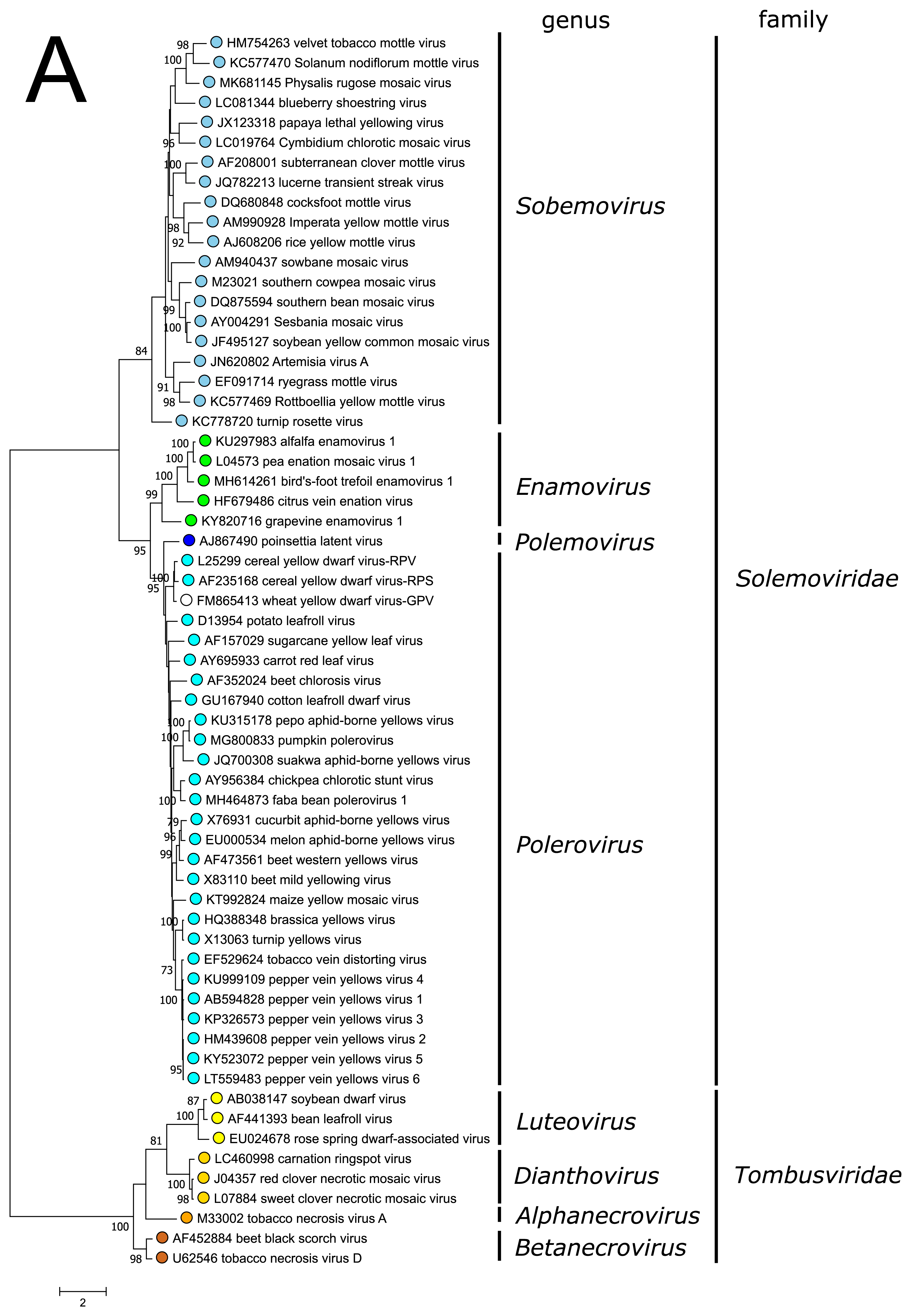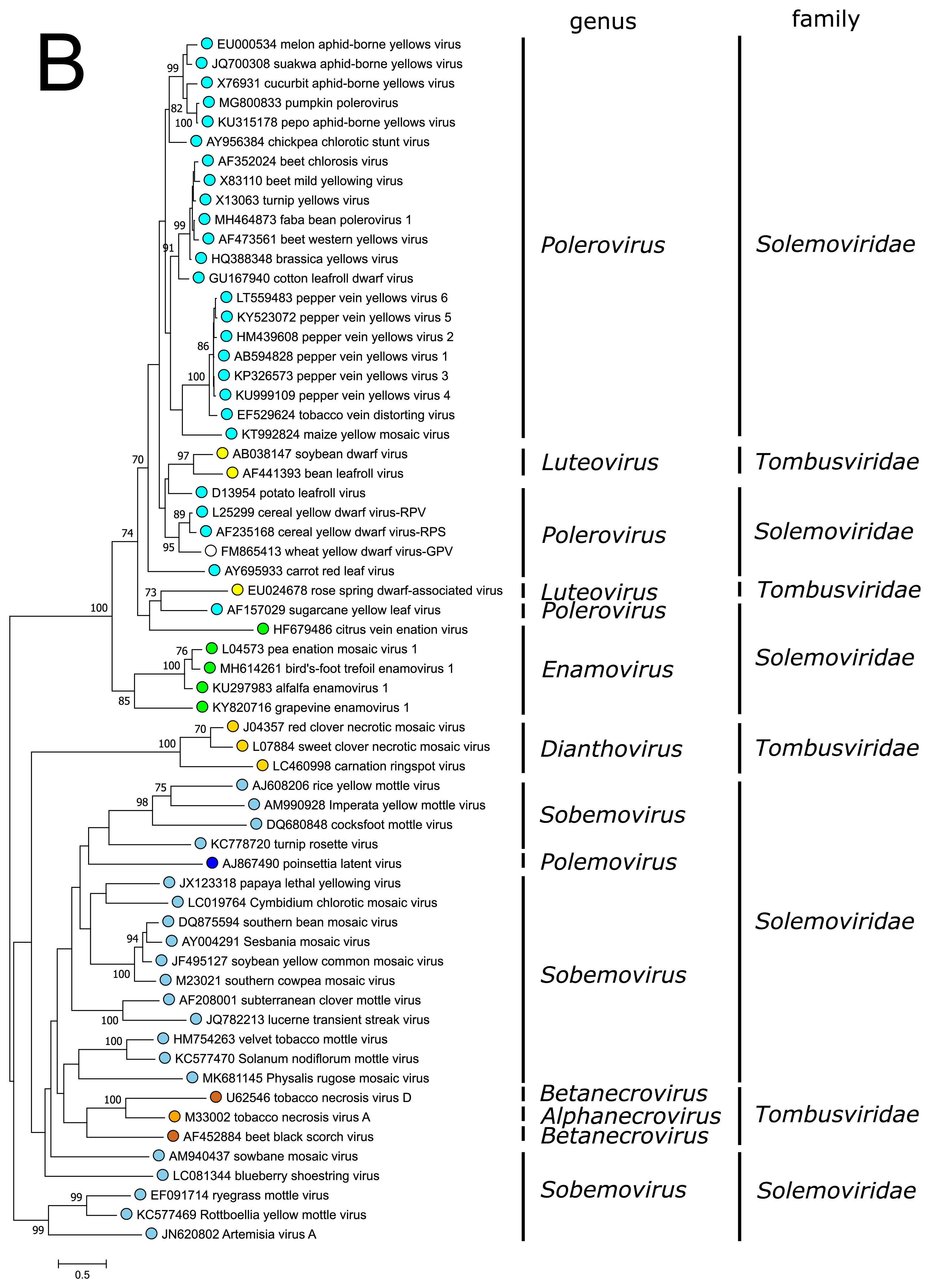 | Figure 3. Solemoviridae. Maximum likelihood phylogenetic trees constructed using the amino acid sequences of (A) RNA-directed RNA polymerase domains (starting at a −1 ribosomal frameshifting site) and (B) capsid proteins. Phylogenetic analysis based on a MUSCLE multiple sequence alignment was performed with either LG (RdRP) or WAG (CP) amino acid substitution model using Seaview 5.0.4 (http://doua.prabi.fr/software/seaview). Both sets of sequences were translated from the complete genomes of the same isolate. The proportion of branches found in 500 bootstrap replicates is indicated if this was > 70%. Coloured dots group members of a genus, with an unclassified virus marked with an open circle. The examples of RdRPs and CPs of alphanecroviruses, betanecroviruses, dianthoviruses and luteoviruses representing the members of family Tombusviridae in the order Tolivirales were used to demonstrate their distant grouping from solemoviral RdRPs but closer relationships with their CPs, respectively. The phylogenetic trees and the corresponding sequence alignments are available for download at the Resources page. |