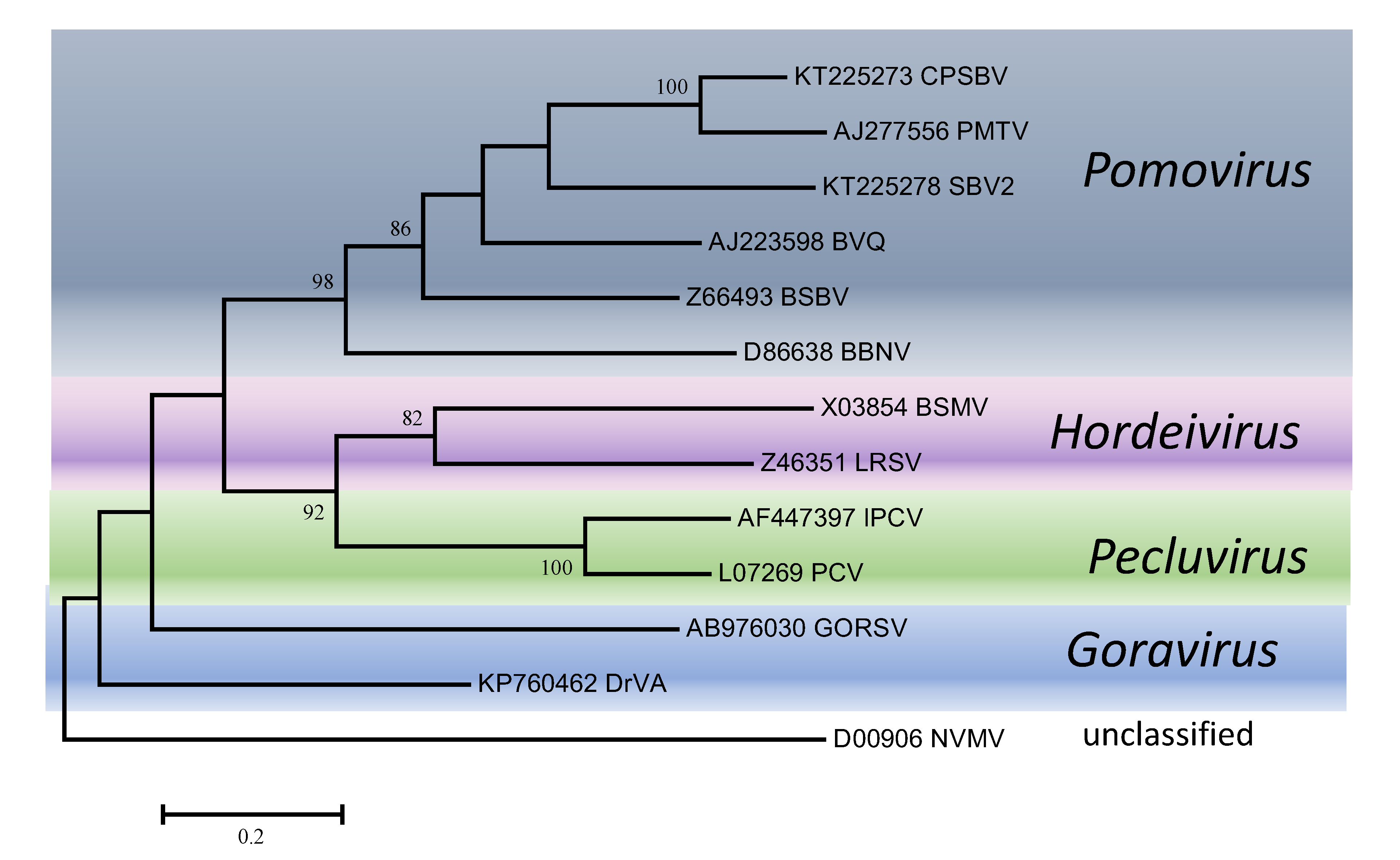 Pecluvirus. This genus contains soil-borne viruses of leguminous and graminaceous plants from India and Africa that are transmitted to plant roots by the plasmodiophorid Polymyxa graminis. Genomes are bipartite; they encode TGB movement proteins.