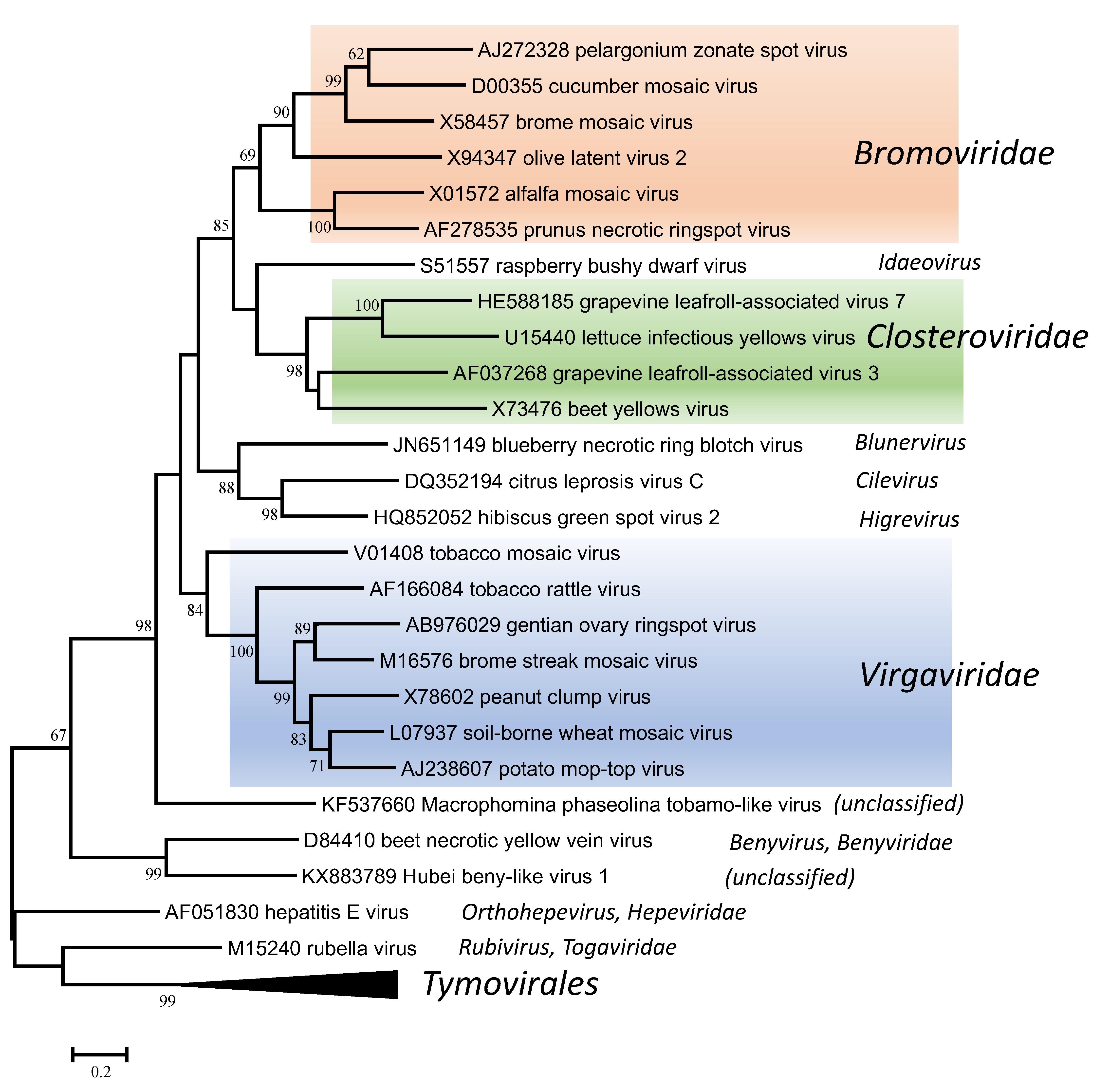 | Figure 6. . Virgaviridae. Phylogenetic tree based on the codon-aligned nucleotide sequences of the RdRP proteins of viruses in the family Virgaviridae and some other viruses. The analyses were conducted in MEGA7 using the Maximum Likelihood method based on the Tamura-Nei model and 1000 bootstrap replicates. The tree with the highest log likelihood (-42095.8020) is shown. The percentage of trees in which the associated taxa clustered together is shown next to the branches (where >60%). The scale indicates the number of substitutions per site. All positions containing gaps and missing data were eliminated. Representative isolates of the type species of the genera Benyvirus, Blunervirus, Cilevirus, Higrevirus, Idaeovirus, Orthohepevirus and Rubivirus and of each of the genera in the families Bromoviridae, Closteroviridae and Virgaviridae and the order Tymovirales were used in the analysis. This phylogenetic tree and corresponding sequence alignment are available to download from the Resources page. |