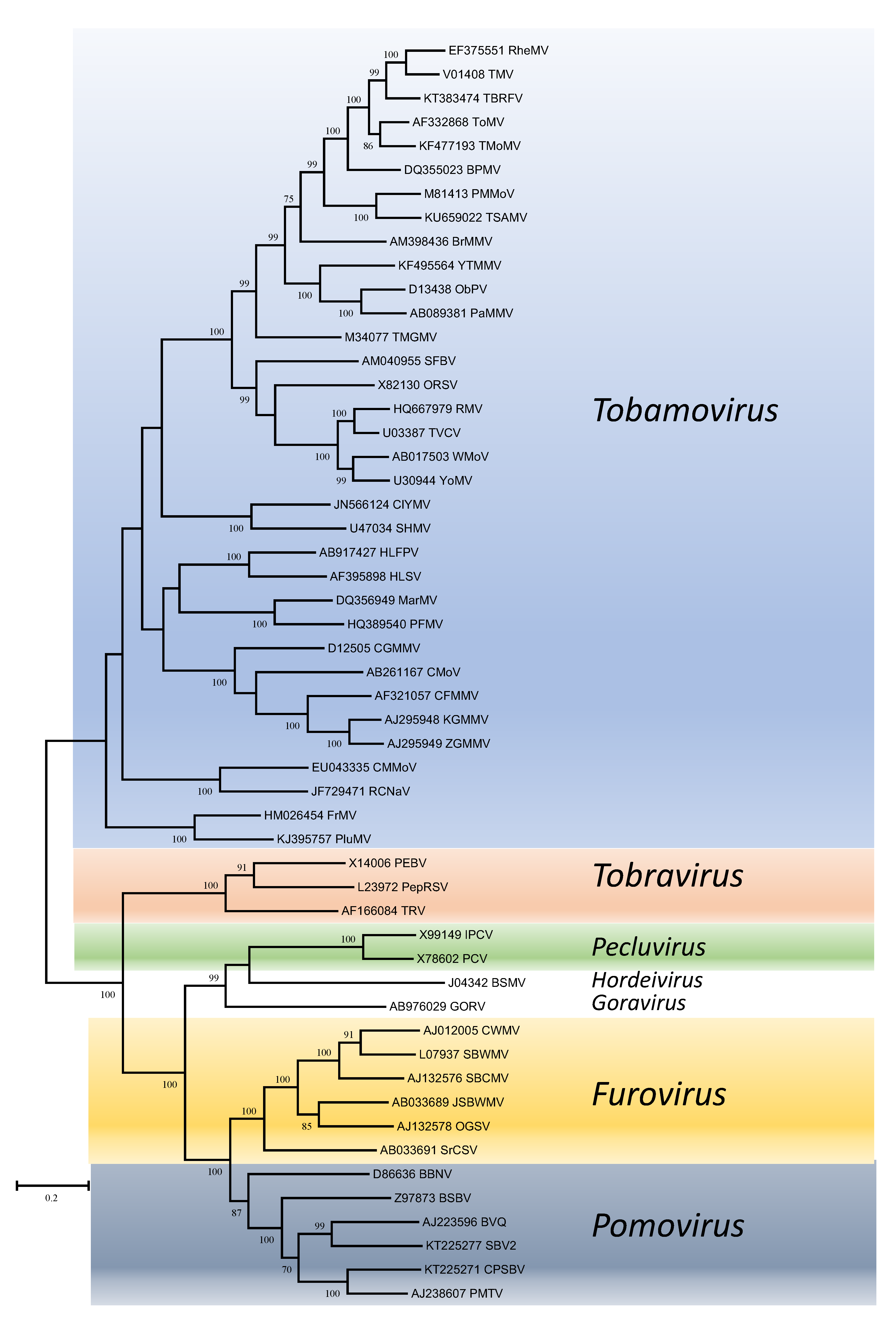 Phylogenetic trees obtained using the entire replication protein including the RdRP (or the conserved Mtr, Hel and RdRP domains) correlate well with genome organisation to support the existence of the different genera. However, these genera are usually reliably delineated, regardless of the protein used (Figures 1. Virgaviridae - 5. Virgaviridae). Using both the replication protein and the coat protein, the genus Tobamovirus separates substantially from the remaining genera. Furovirus and Pomovirus occur together on the same branch in all trees as do Pecluvirus, Goravirus and Hordeivirus.