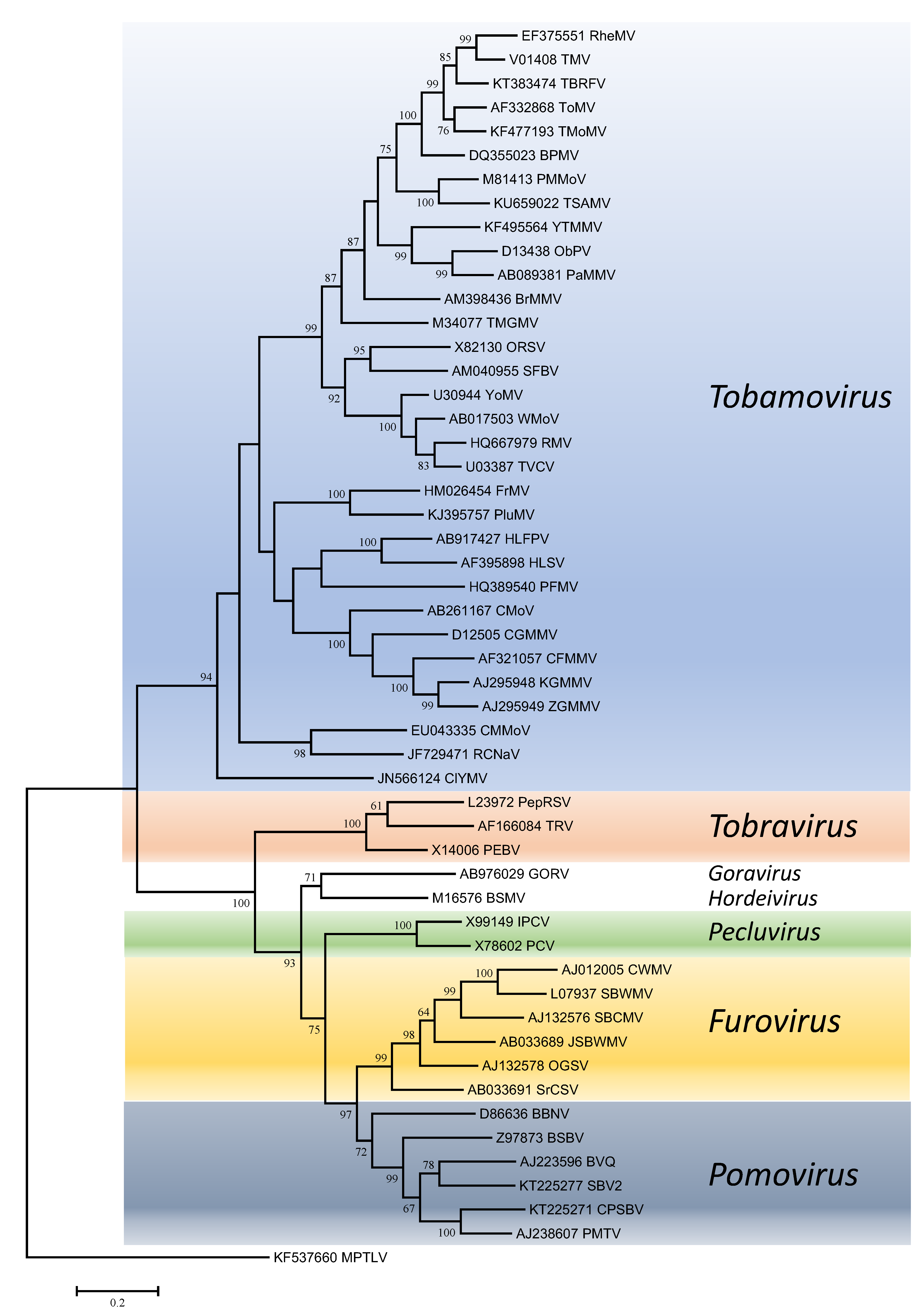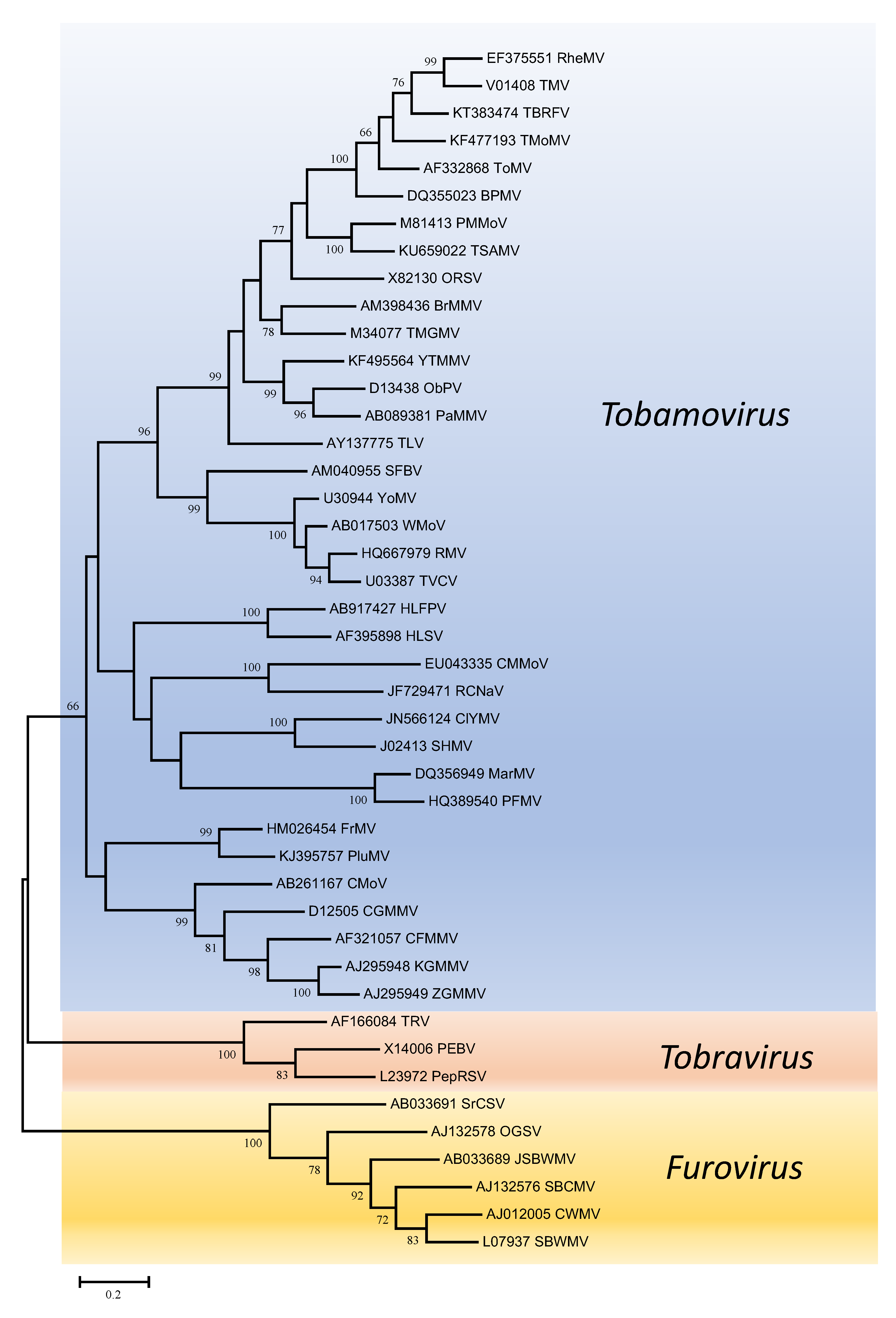 | Figure 3. . Virgaviridae. Phylogenetic tree based on the codon-aligned nucleotide sequences of the coat proteins of viruses in the family Virgaviridae. The analyses were conducted in MEGA7 using the Maximum Likelihood method based on the Tamura-Nei model and 1000 bootstrap replicates. The tree with the highest log likelihood (-19333.2064) is shown. The percentage of trees in which the associated taxa clustered together is shown next to the branches (where >60%). The scale indicates the number of substitutions per site. All positions containing gaps and missing data were eliminated. Virus abbreviations are explained in the tables of member species and other viruses. This phylogenetic tree and corresponding sequence alignment are available to download from the Resources page. |