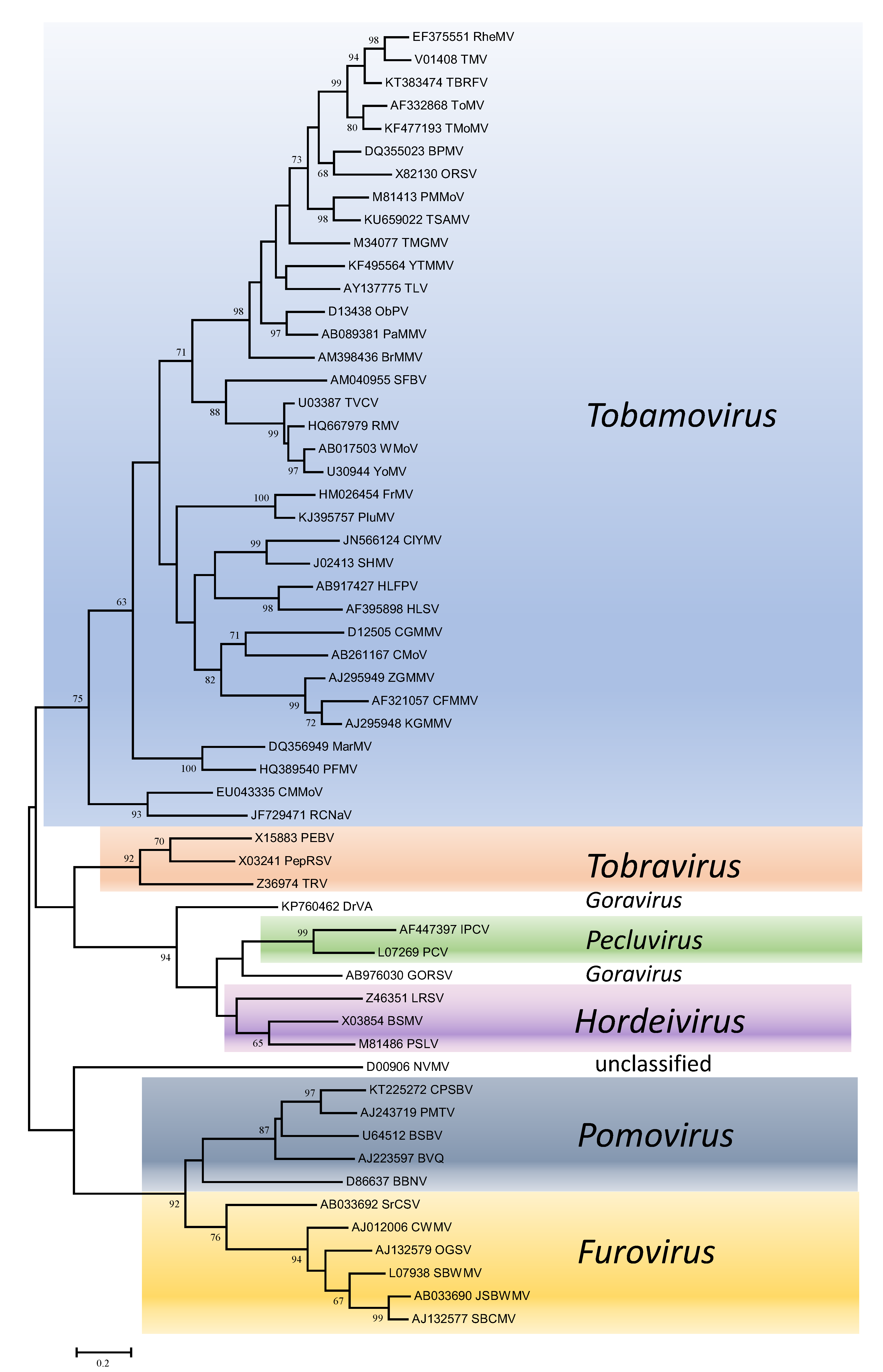 | Figure 2. . Virgaviridae. Phylogenetic tree based on the codon-aligned nucleotide sequences of the RdRP domain of viruses in the family Virgaviridae. The analyses were conducted in MEGA7 using the Maximum Likelihood method based on the Tamura-Nei model and 1000 bootstrap replicates. The tree with the highest log likelihood (-57431.3254) is shown. The percentage of trees in which the associated taxa clustered together is shown next to the branches (where >60%). The scale indicates the number of substitutions per site. All positions containing gaps and missing data were eliminated. Virus abbreviations are explained in the tables of member species and other viruses. This phylogenetic tree and corresponding sequence alignment are available to download from the Resources page. |